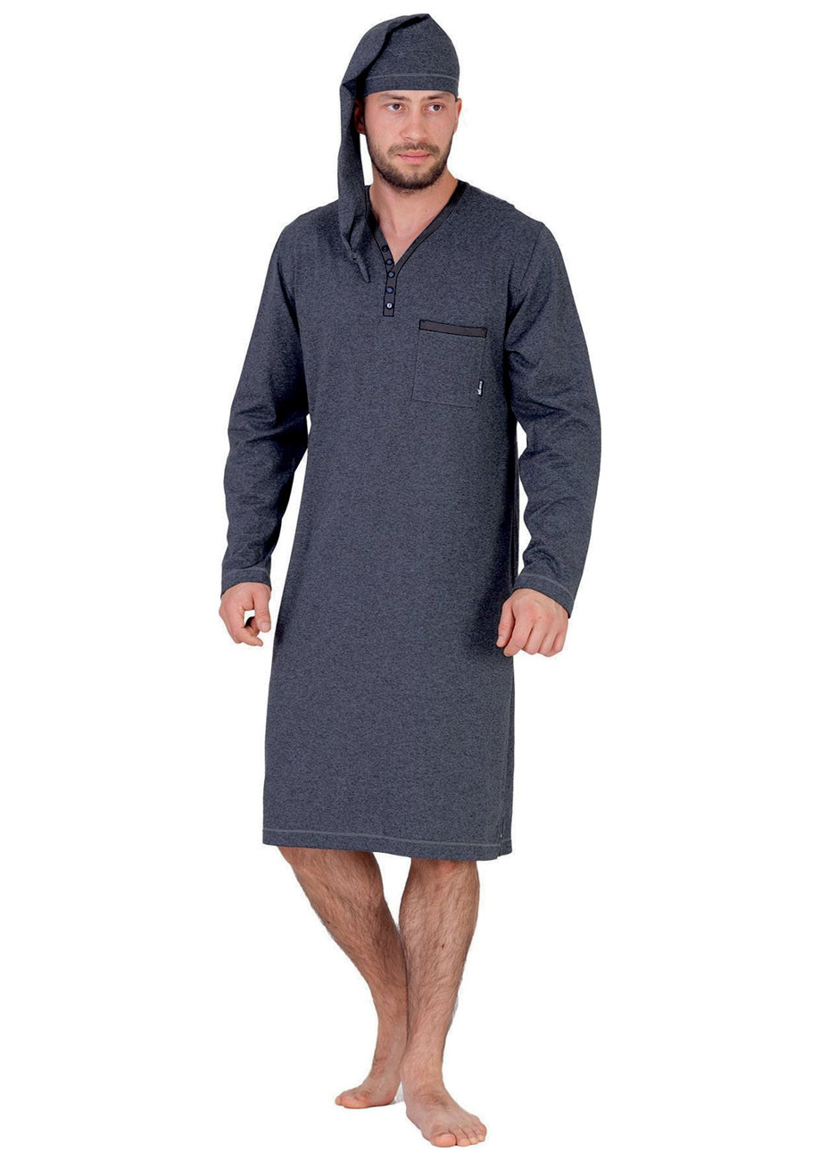 pánska nočná košeľa s dlhým rukávom a čiapkou - s ozdobnou úzkou légou imitujúcou zapínanie