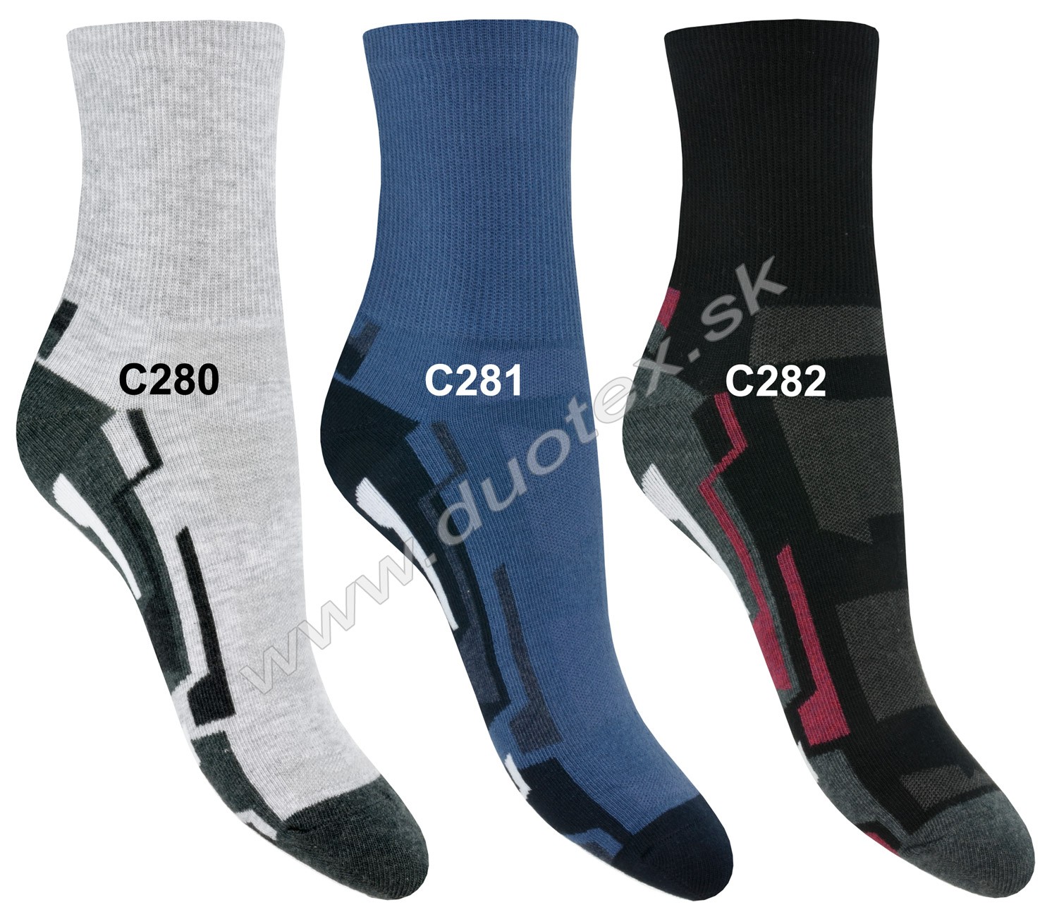 bavlnené elastické športové ponožky s vysokým elastickým rebrovaným preveseným lemom, ktorý zabezpečuje výbornú stabilitu ponožky na nohe a zvyšuje tým komfort pri nosení. S plochým švom na špičke.