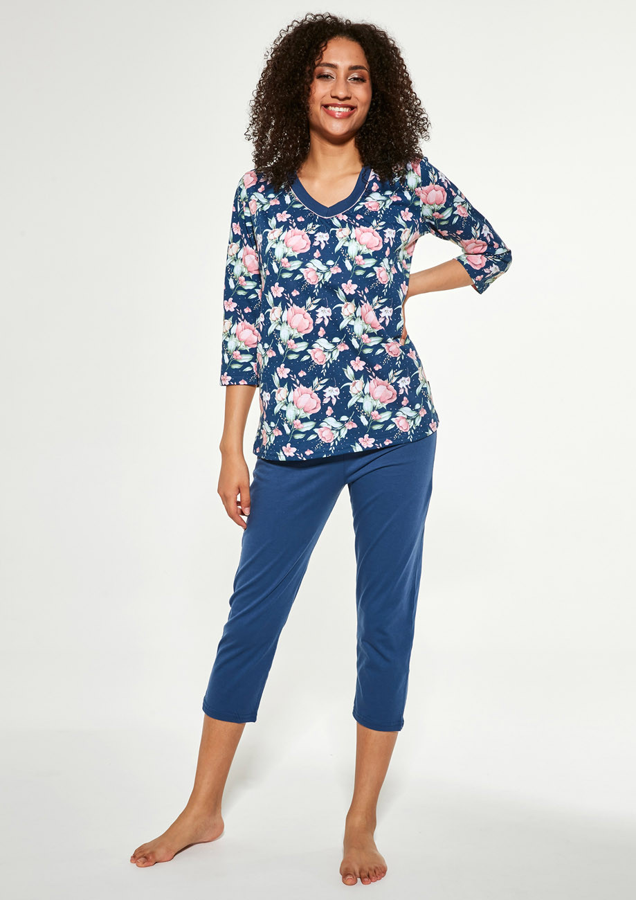 dámske pyžamo s výstrihom do tvaru V so 7/8 rukávom a 7/8 nohavicami, všívaná široká guma v páse nohavíc. Pyžamo je vyrobené zo 100% bavlneného úpletu.