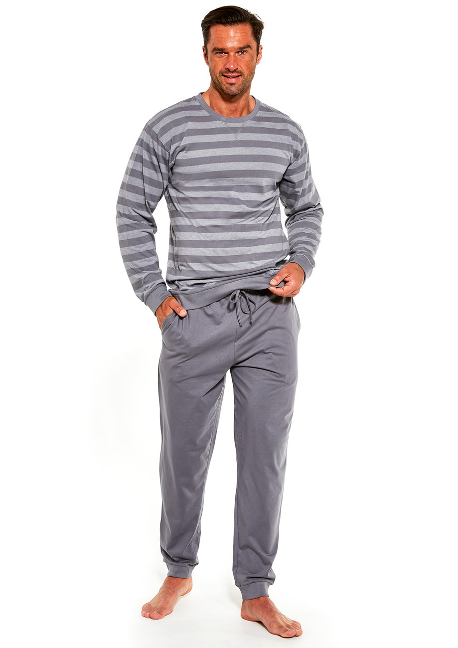Pánske pyžamo s dlhým rukávom a dlhými nohavicami s bočnými vreckami. Všívaná guma v páse nohavíc. Spodná časť vrchného dielu, rukávov a nohavíc je stiahnutá do pružného lemu.