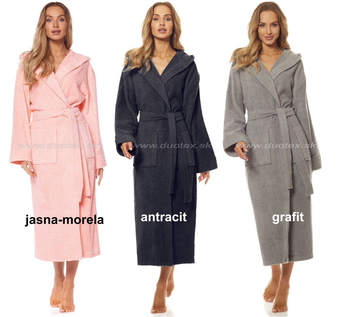dámsky dlhý zavinovací župan s kapucňou a našívanými vreckami vyrobený z mäkkého bavlneného froté