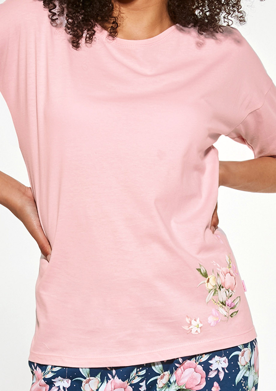dámske pyžamo so 7/8 rukávom a 7/8 nohavicami, všívaná široká guma v páse nohavíc. Pyžamo je vyrobené zo 100% bavlneného úpletu.