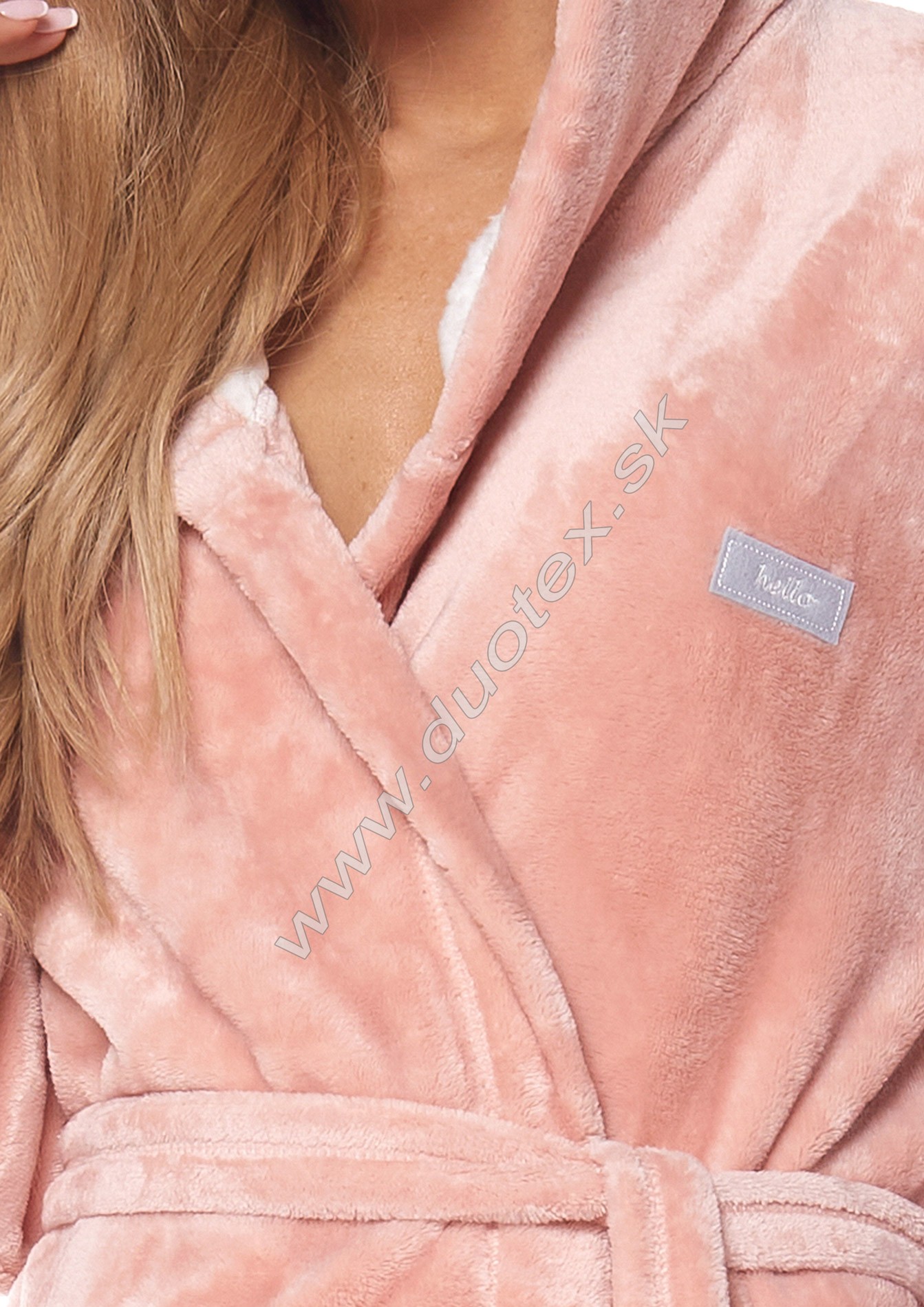 dámsky krátky zavinovací župan s kapucňou vyhotovený z mäkkučkého hrubého postrihovaného plyšu, všívané bočné vrecká.