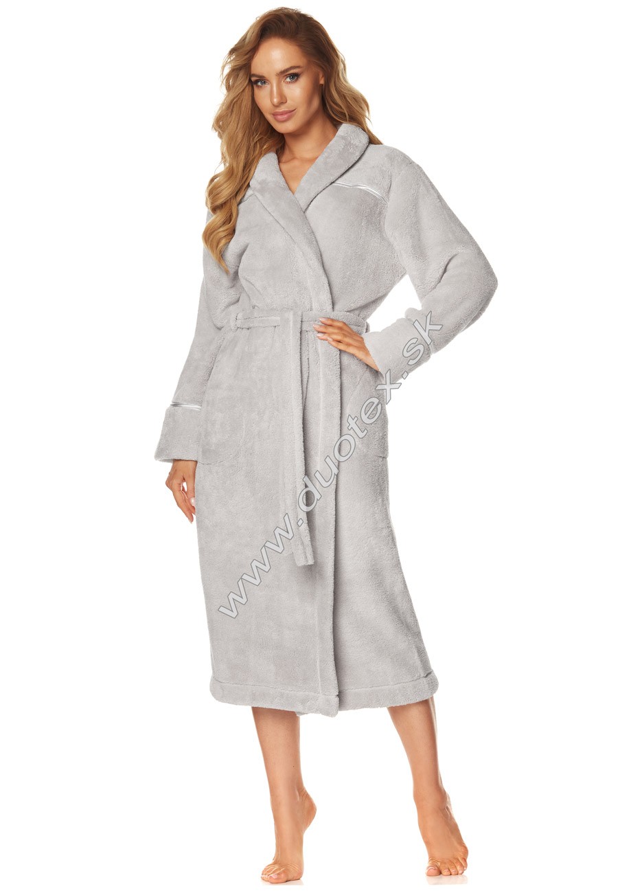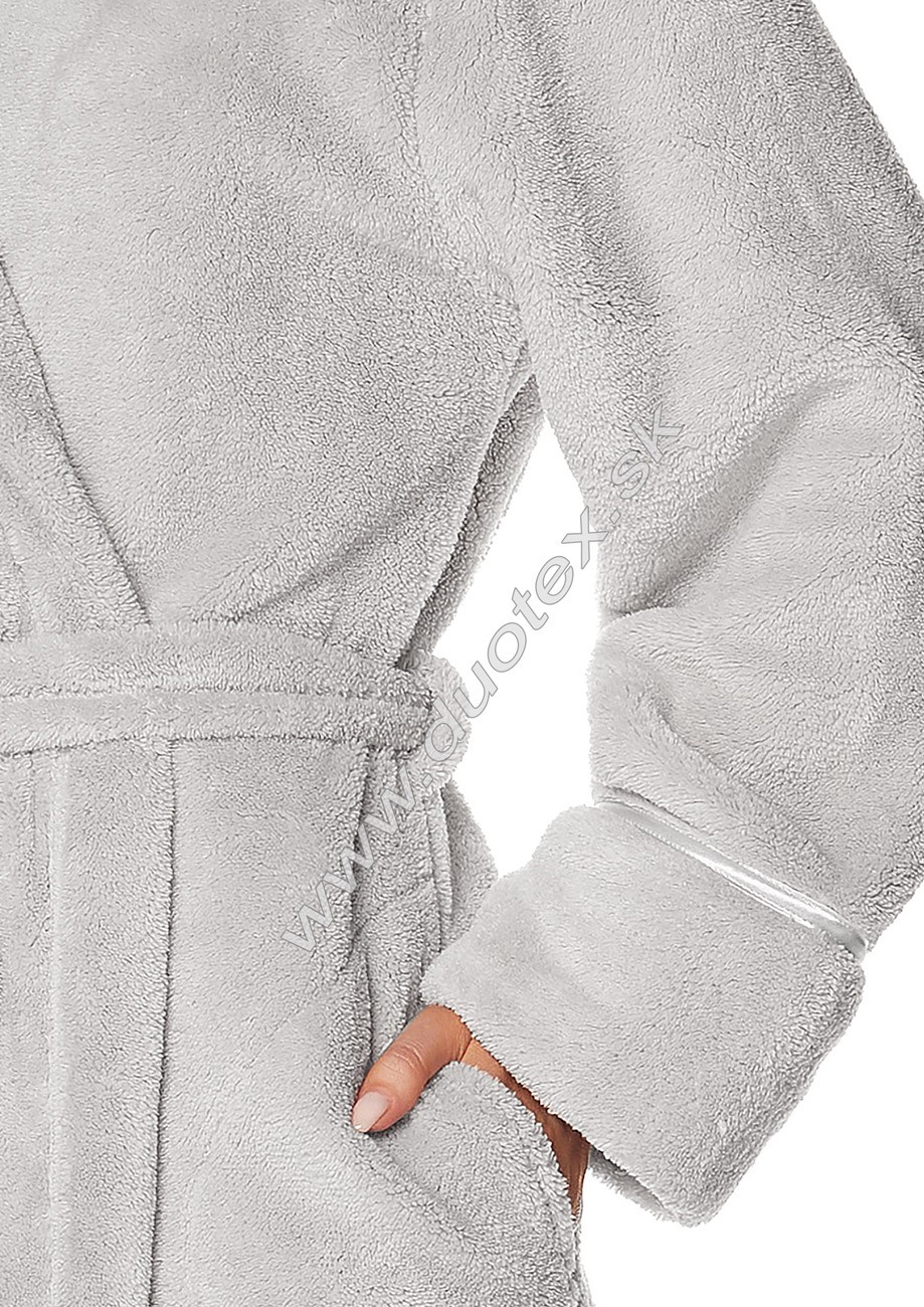 dámsky dlhý zavinovací župan so šálovým golierom vyhotovený z mäkkučkého hrubého postrihovaného plyšu, všívané bočné vrecká