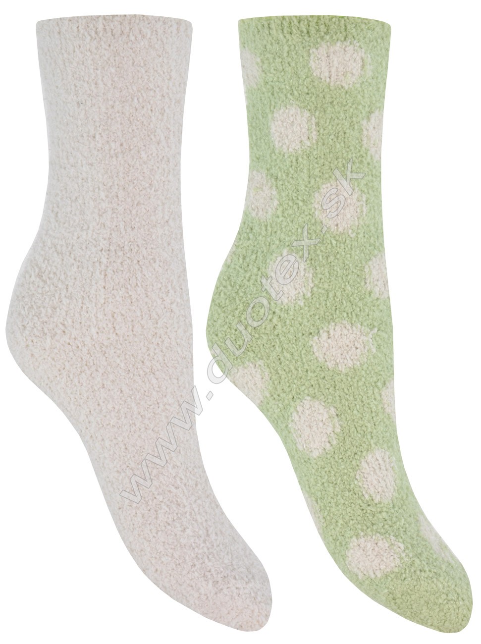 dámske teplé, mäkké, chlpaté ponožky z mikroplyšu vhodné na spanie alebo ako pohodlné domáce ponožky. 2 páry ponožiek vo zväzku sú spojené jednou etiketou. Dvojpack sa skladá z dvoch rôznych farieb - viď. obrázok.