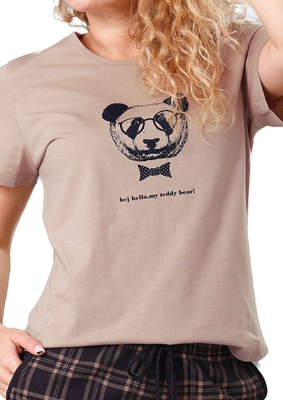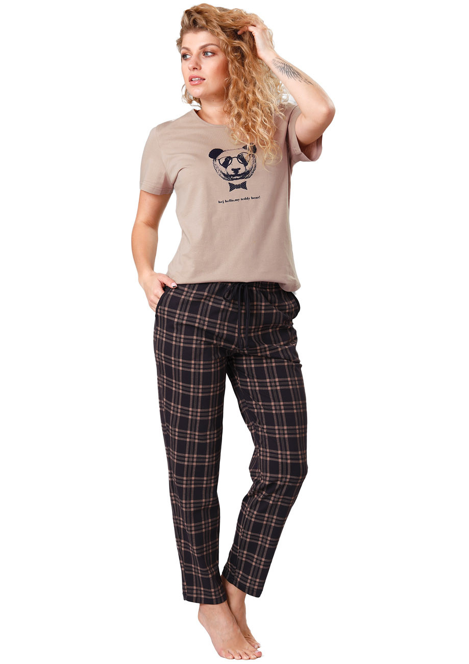 dámske pyžamo s krátkym rukávom vyrobené z úpletu zo 100% bavlny, dlhé nohavice s bočnými vreckami - všívaná guma v páse nohavíc