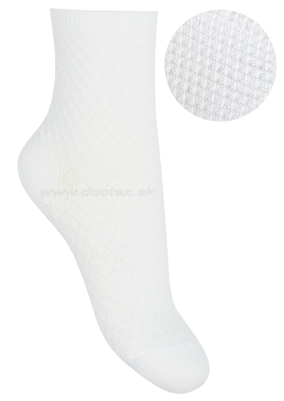 detské biele elastické bavlnené ponožky s plastickým ažúrovým vzorom, obracaný lem.