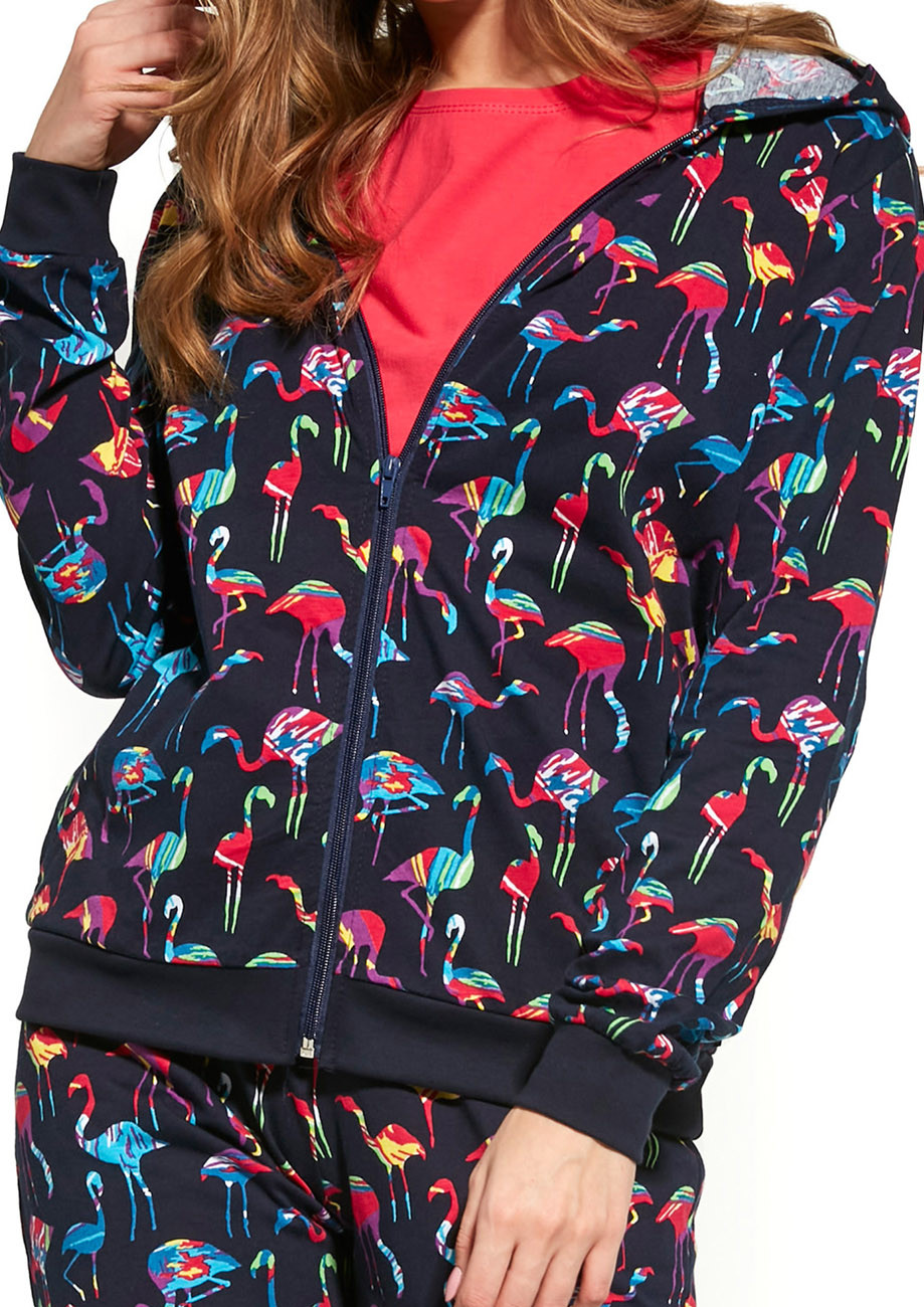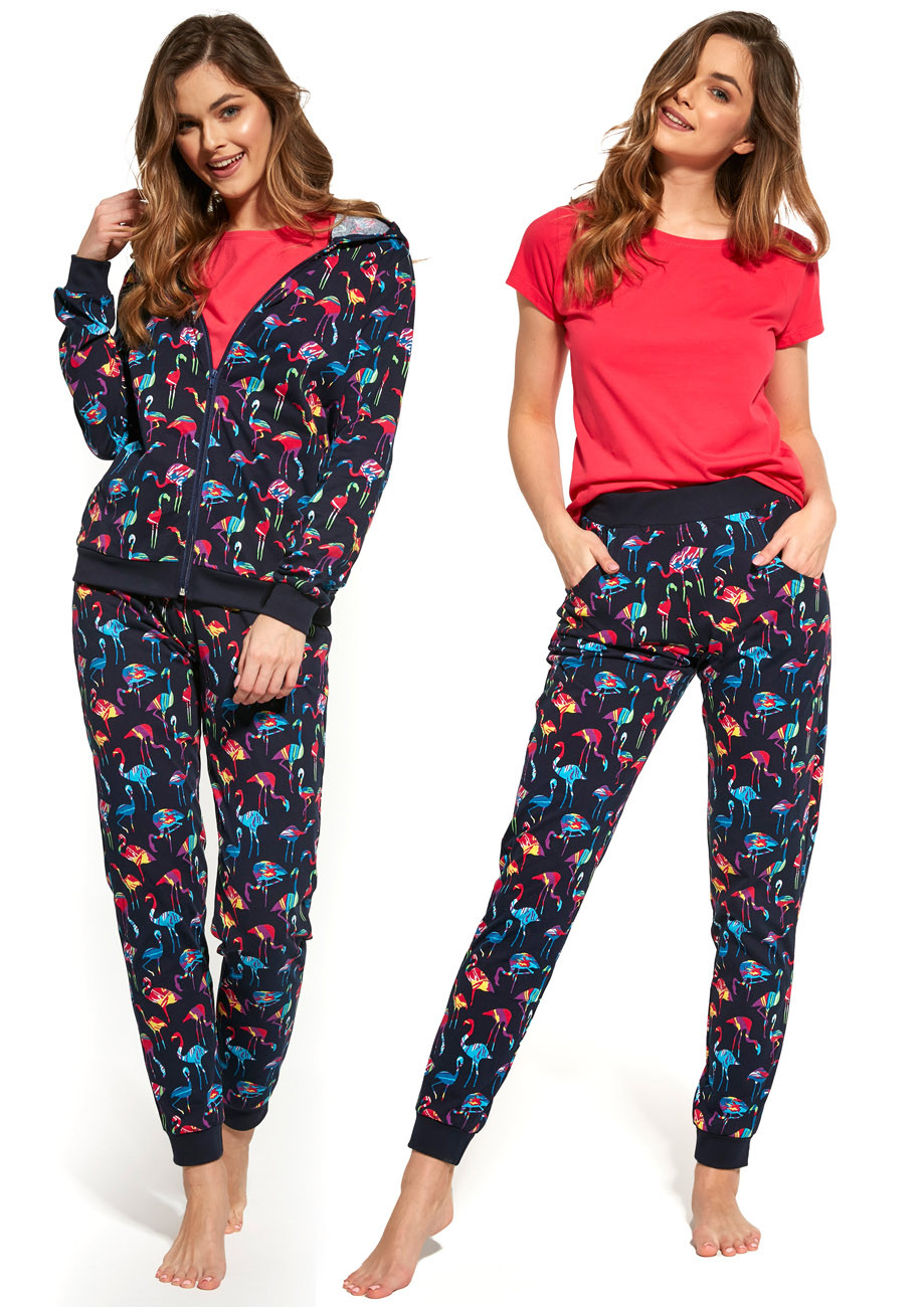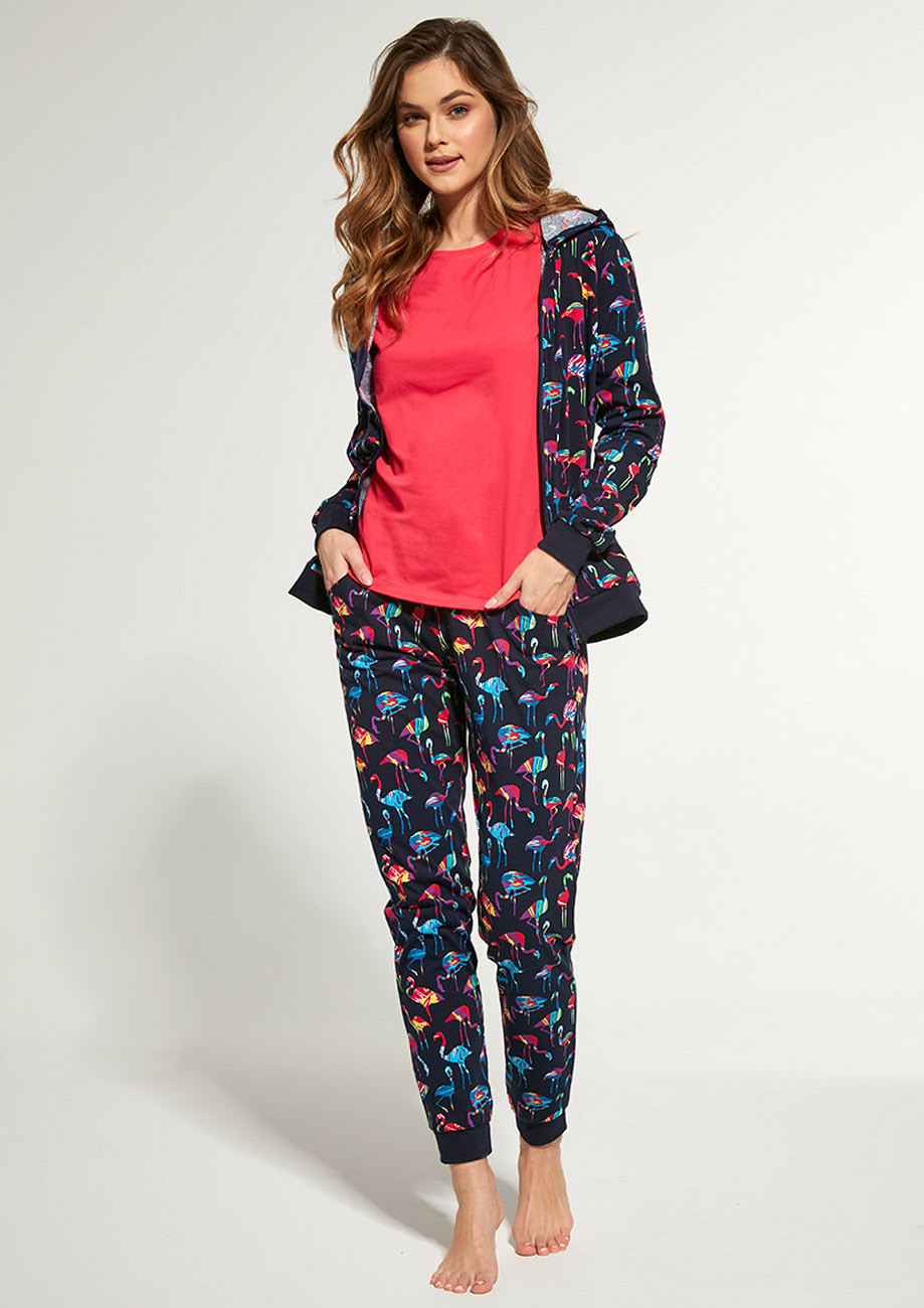 Dámske trojdielne pyžamo zo 100% bavlny. Sada obsahuje: tričko s krátkym rukávom, mikinu na zips s kapucňou a vreckami, dlhé nohavice s bočnými vreckami a širokou gumou v páse lemovanou bavlneným úpletom. Spodná časť mikiny a nohavíc je ukončená pružným patentom. Táto trojdielna sada je vhodná aj ako domáce oblečenie.