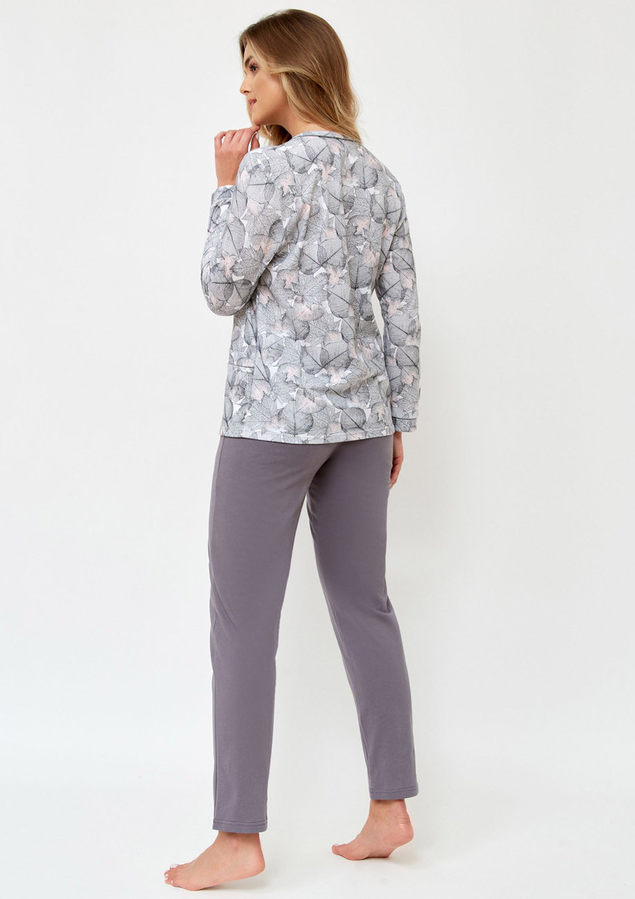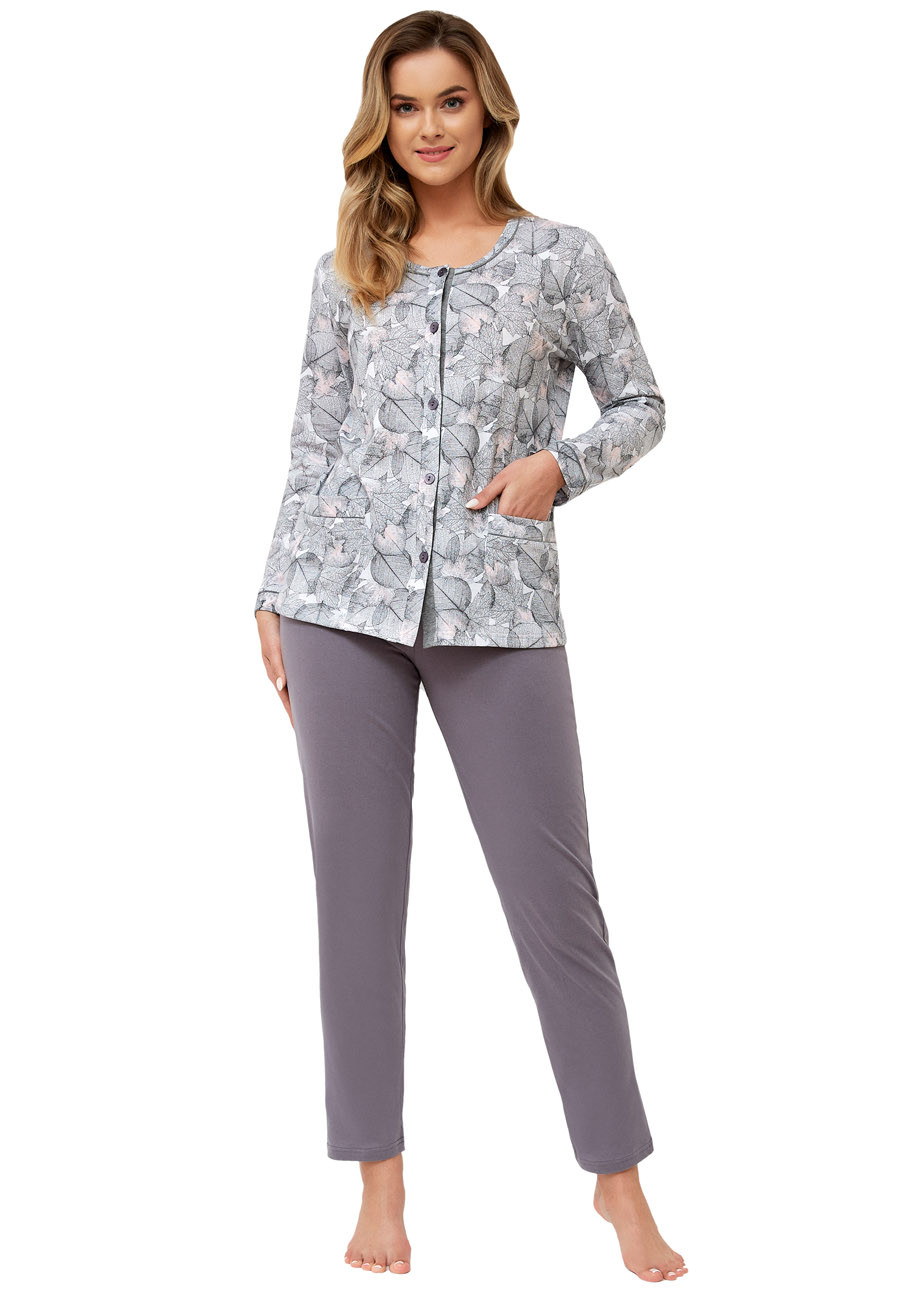 dámske pyžamo s dlhými rukávmi a dlhými nohavicami a zapínaním pozdĺž predného dielu. Pyžamo je vyrobené zo 100% bavlny, všívaná guma v páse nohavíc