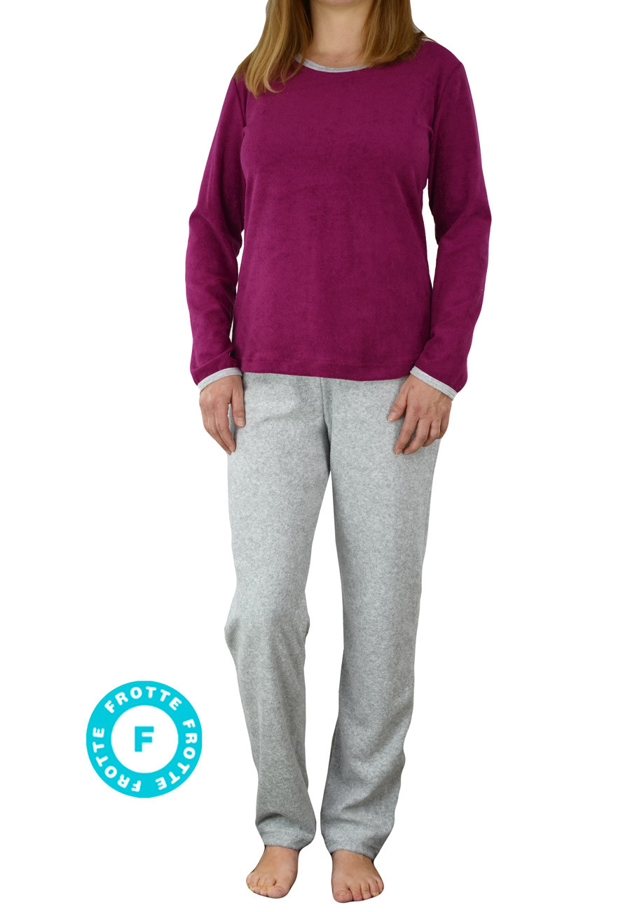 dámske froté pyžamo s dlhým rukávom a dlhými nohavicami s vysokým sedom, navliekaná guma v páse nohavíc