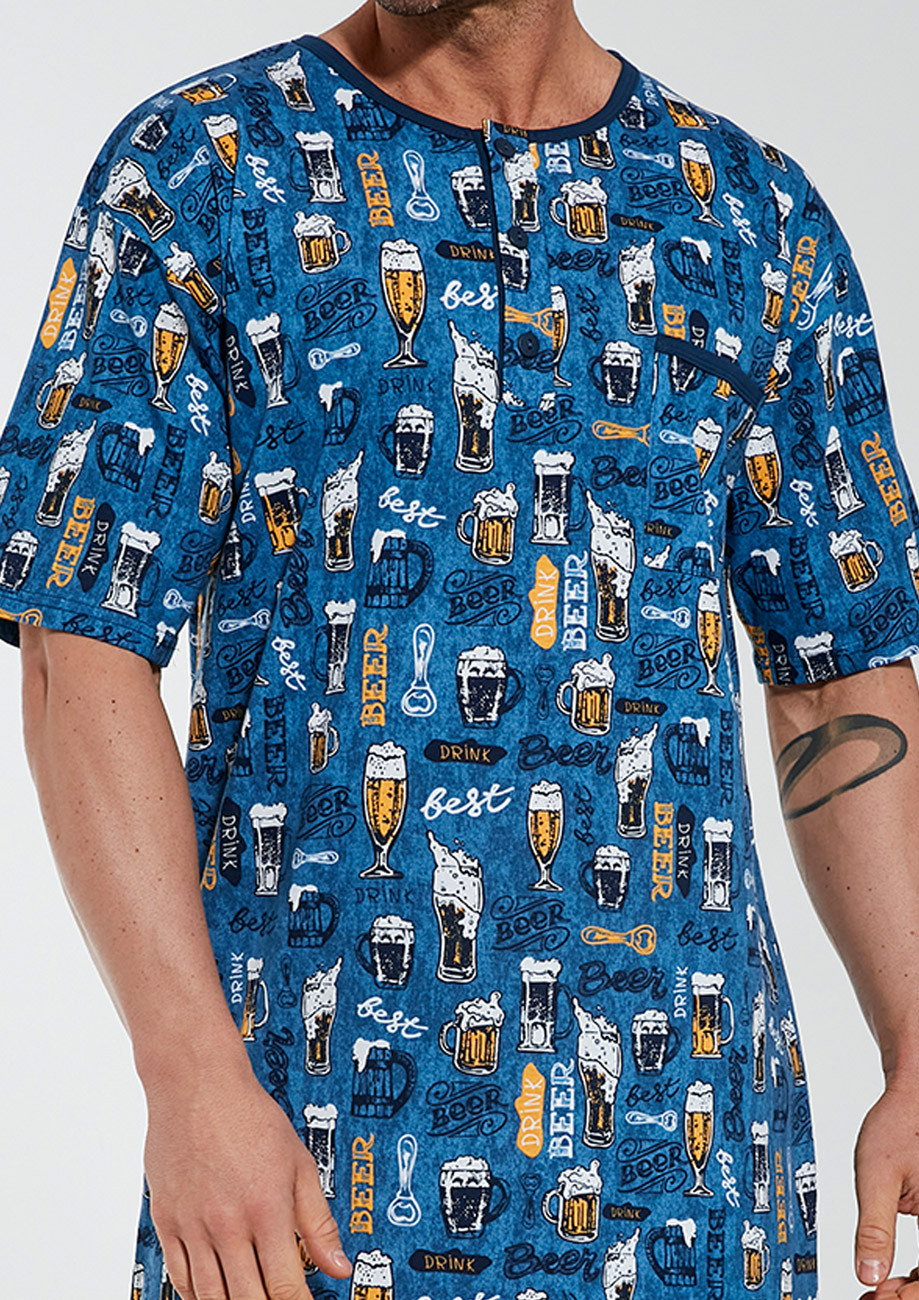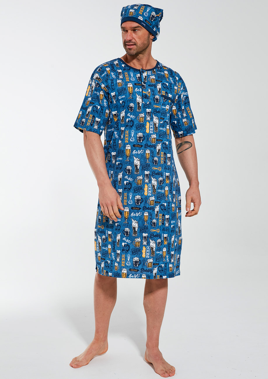 pánska nočná košeľa s čiapočkou s krátkym rukávom a légou na zapínanie vyrobená z úpletu zo 100%bavlny