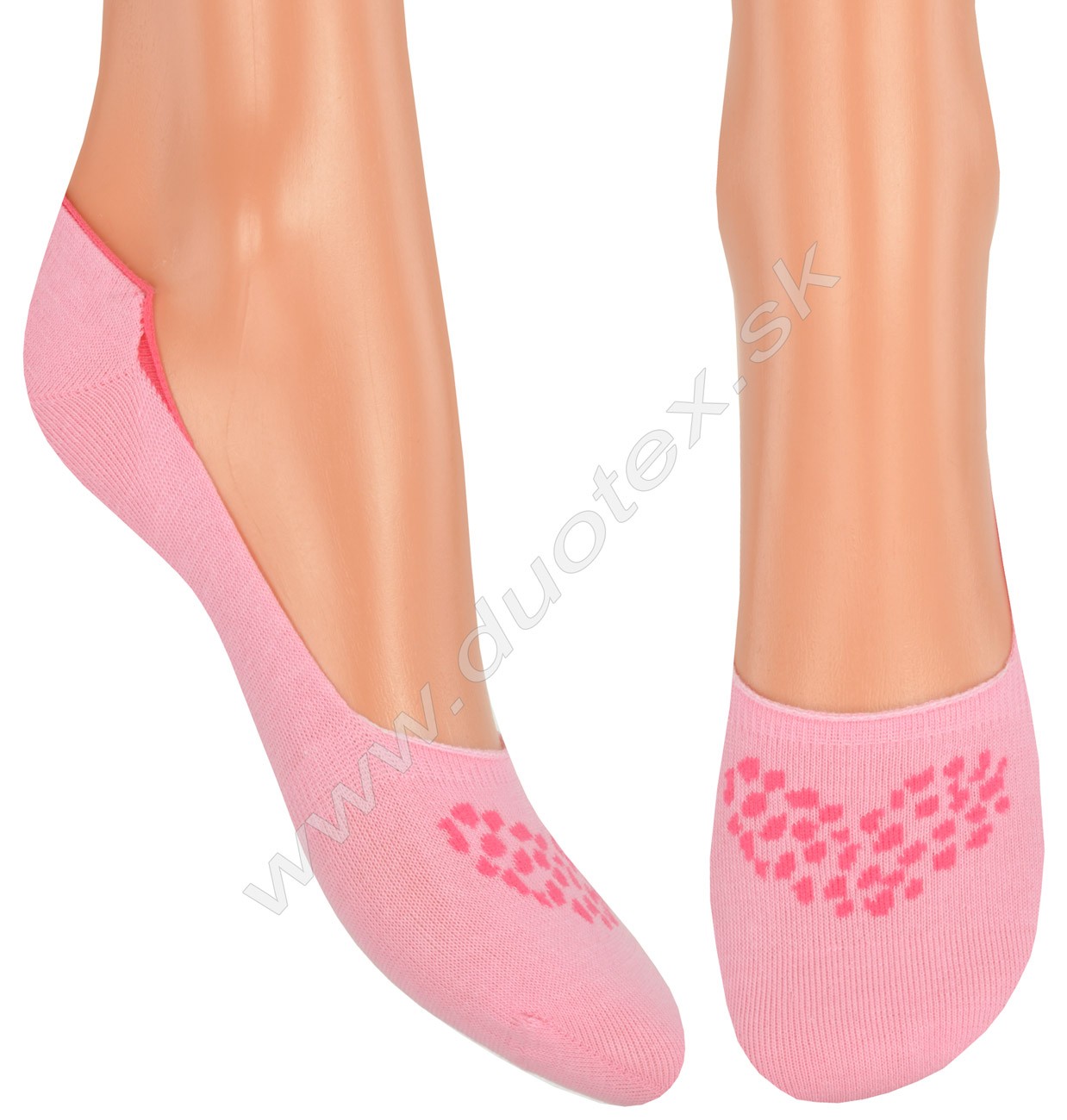dámske tenké jemne vzorované elastické ponožky vhodné do mokasín. Špeciálna konštrukcia päty doplnená silikónom zabraňuje zosúvaniu ponožky z päty. Netlačiaci elastický prúžok po obvode chodidla fixuje ponožku proti posuvu.