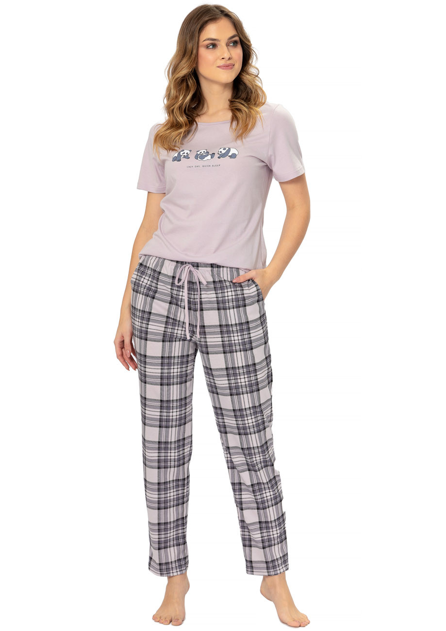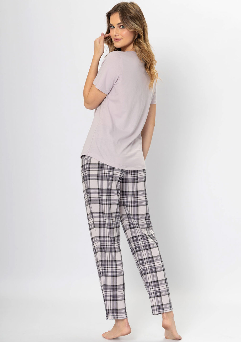 dámske pyžamo s krátkym rukávom vyrobené zo 100% bavlny, dlhé nohavice s bočnými vreckami - všívaná guma v páse nohavíc