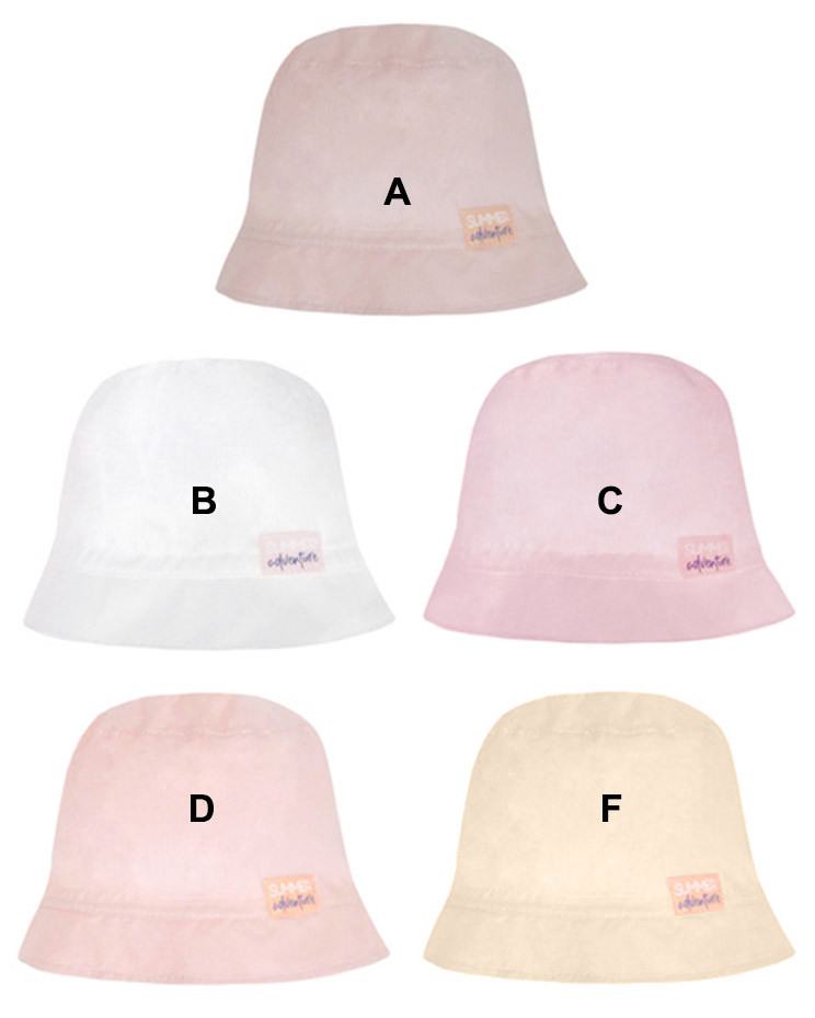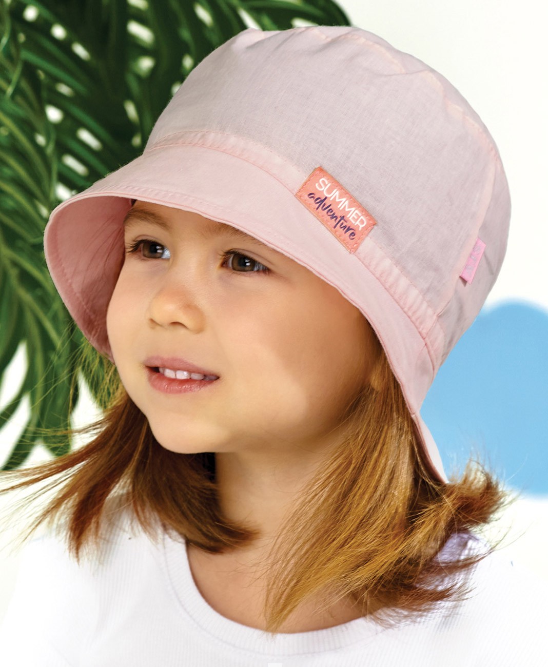Detský letný klobúčik vyrobený z tenkej bavlnenej tkaniny v zadnej časti stiahnutý do gumičky.