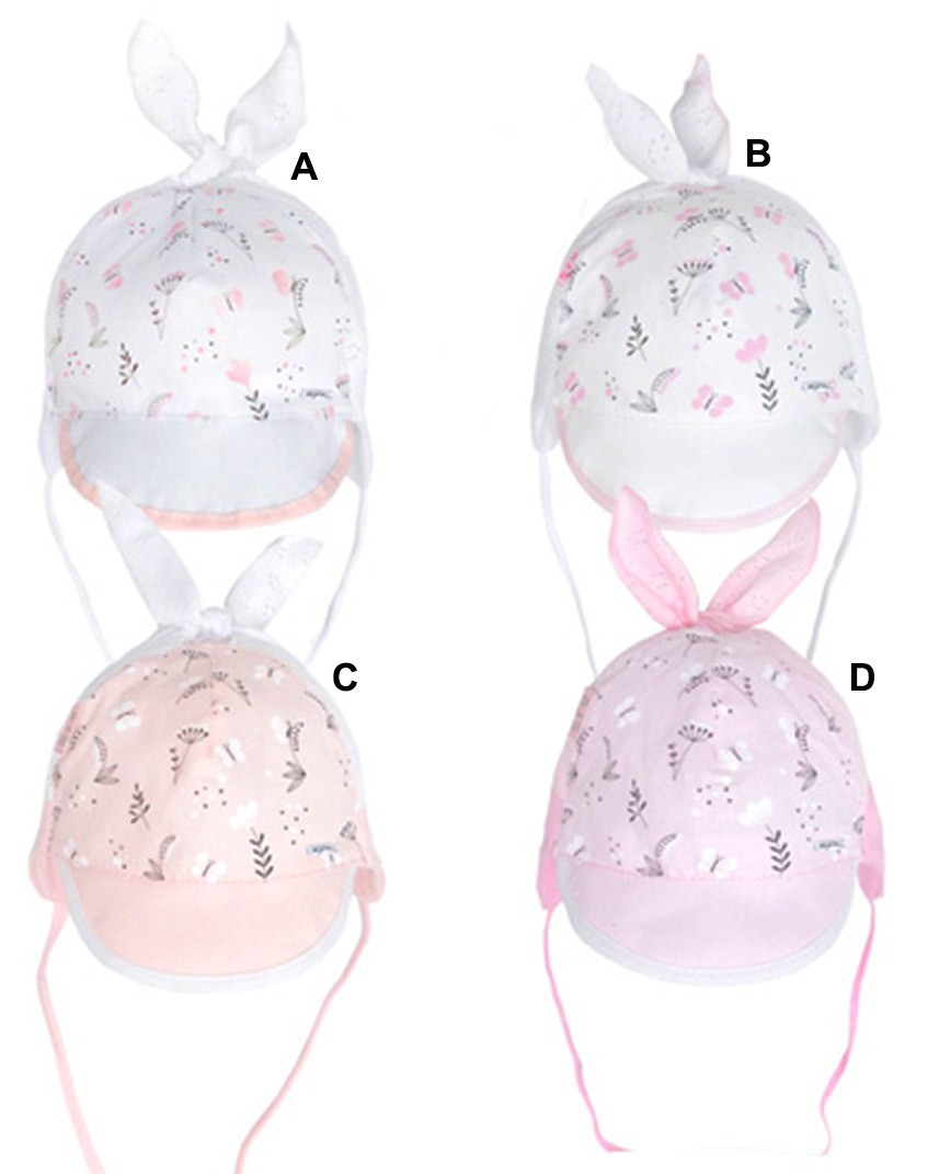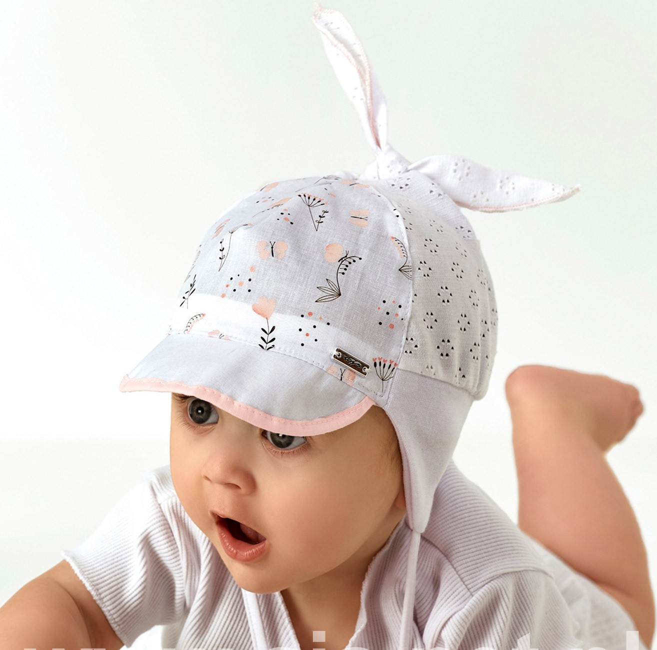 Detská letná čiapočka so šiltom z tenkej bavlnenej tkaniny a úpletu. Je vyrobená s ochranou ušiek proti vetru a so šnúrkami na viazanie.