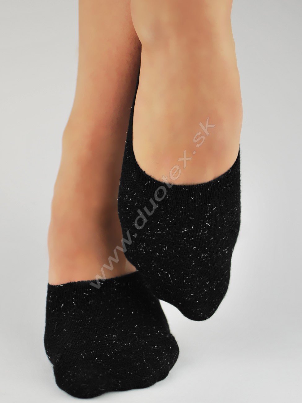 dámske elastické ponožky s jemným trblietavým vzorom vhodné do mokasín vyrobené z tenkej nepriehľadnej bavlny. Špeciálna konštrukcia päty doplnená silikónom, ktorý zabraňuje zosúvaniu ponožky z päty. Netlačiaci elastický prúžok po obvode chodidla fixuje ponožku proti posuvu.