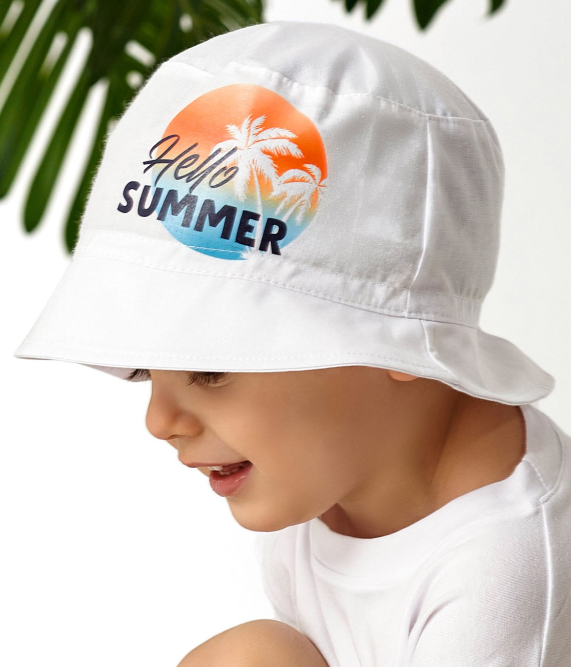 Detský letný klobúčik vyrobený z tenkej bavlnenej tkaniny v zadnej časti stiahnutý do gumičky.