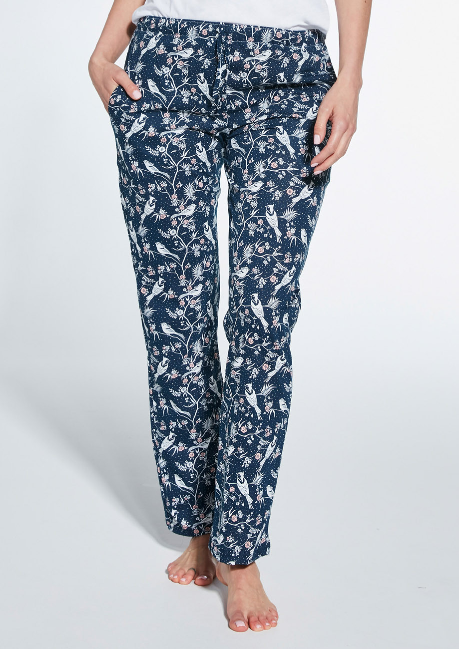Dámske dlhé pyžamové nohavice s bočnými vreckami vyrobené z úpletu zo 100% bavlny - všívaná guma a tunel so sťahovacou šnúrkou v páse nohavíc.