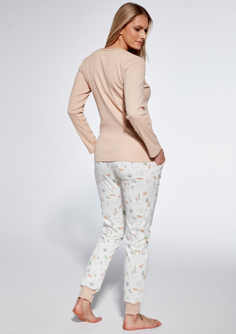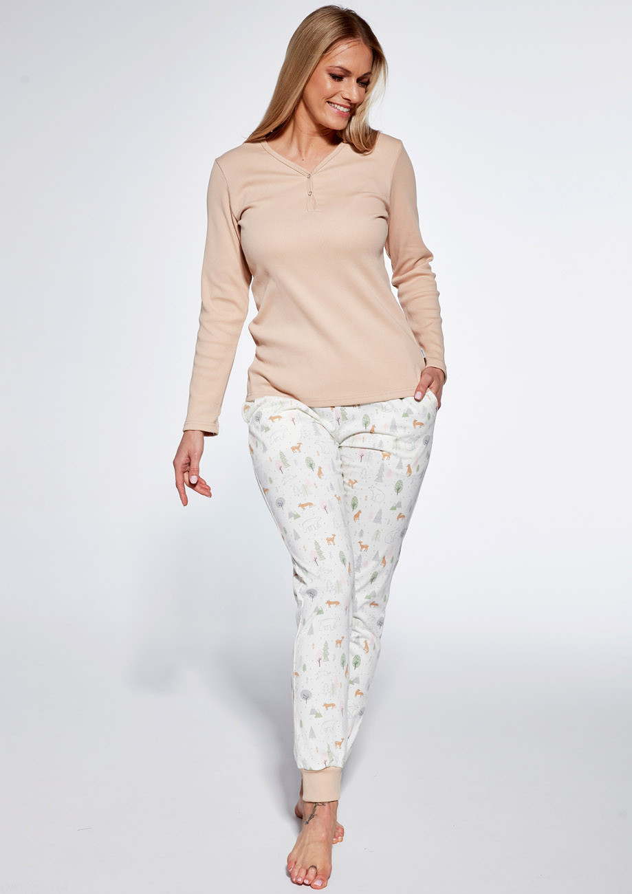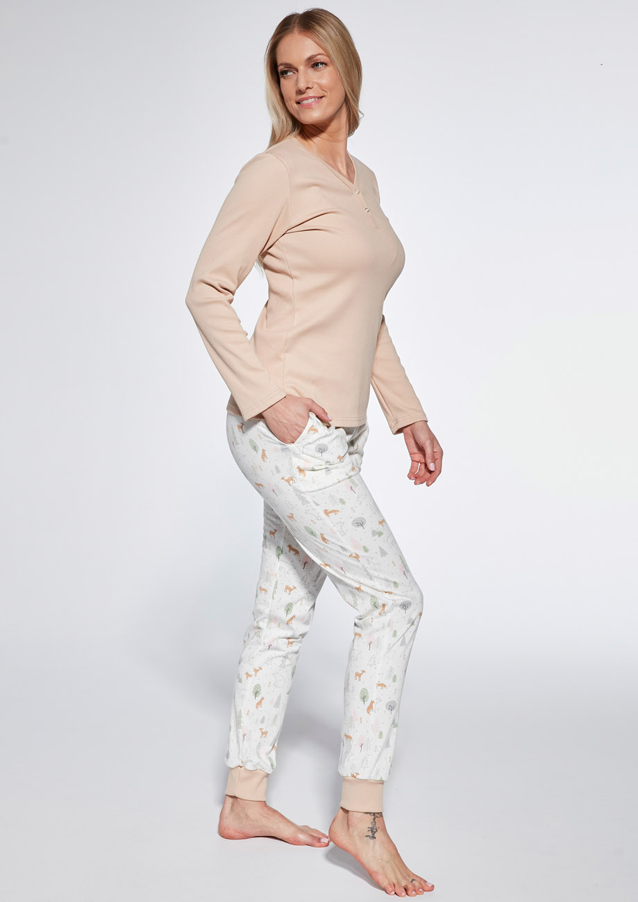 dámske pyžamo s dlhým rukávom a dlhými nohavicami s bočnými vreckami- všívaná guma v páse nohavíc. Spodná časť nohavíc je ukončená pružným lemom, predný diel je z rebrovaného úpletu a je vyhotovený s krátkou légou na zapínanie