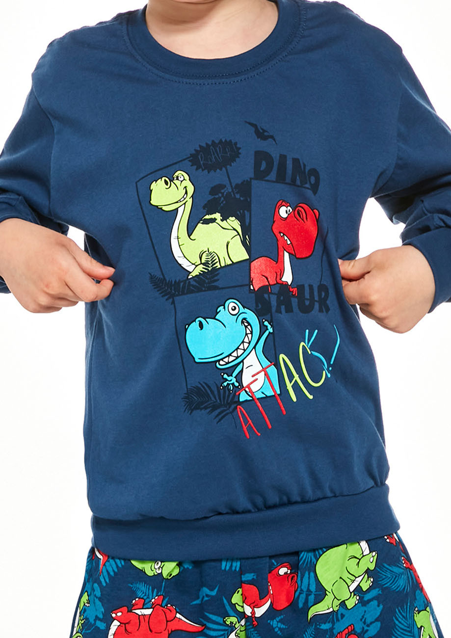 chlapčenské pyžamo s dlhým rukávom a dlhými nohavicami, všívaná široká guma v páse nohavíc. Spodná časť vrchného dielu, rukávov i nohavíc je ukončená pružným patentom.