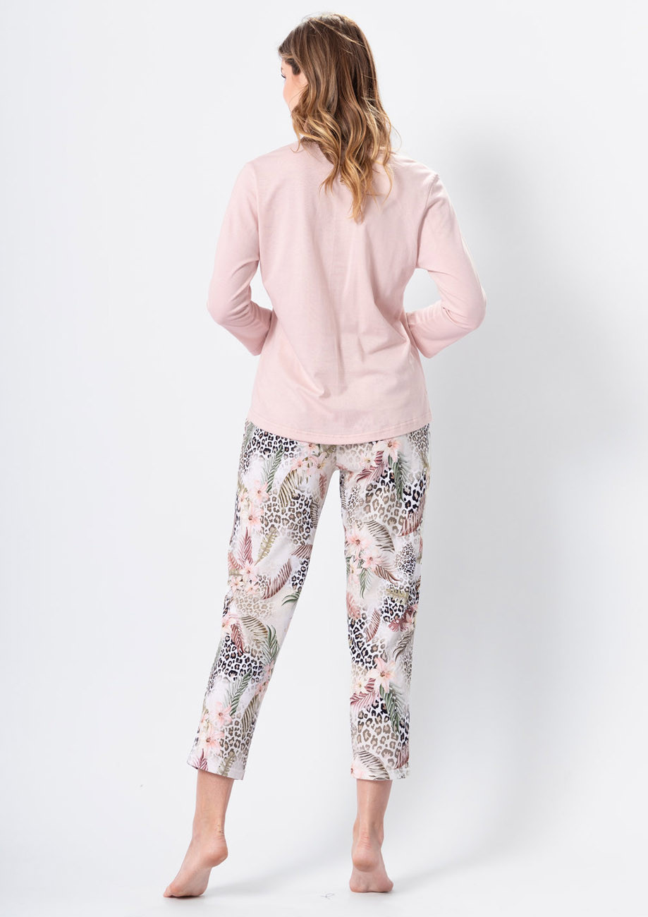 dámske pyžamo s dlhými rukávmi a dlhými nohavicami vyrobené z vysoko kvalitného mäkkého, hladkého úpletu zo 100% bavlny. Pyžamo je vyhotovené s všívanou gumou v páse nohavíc.