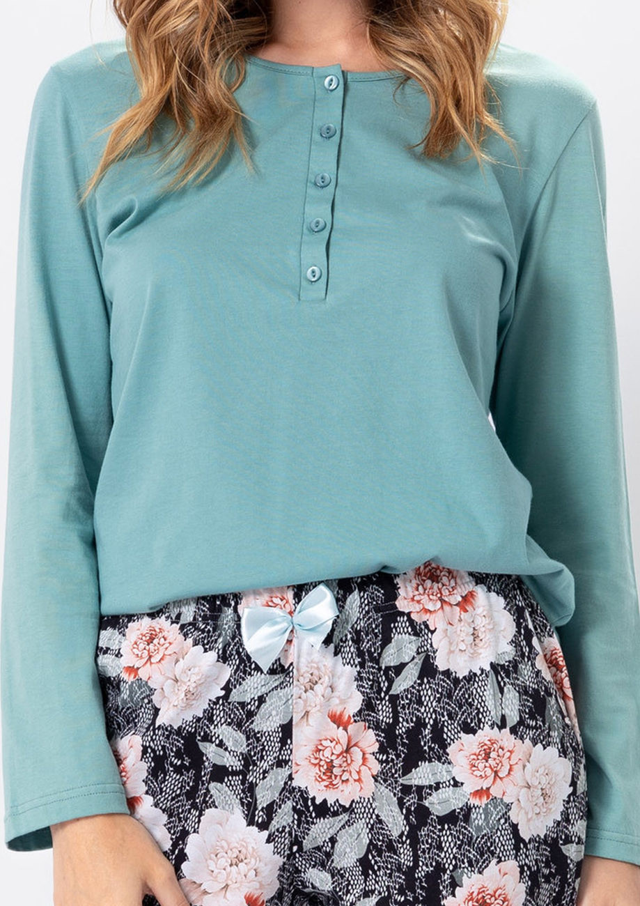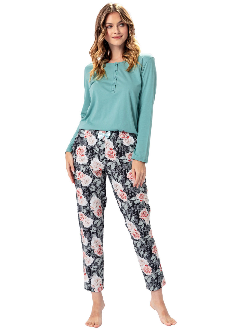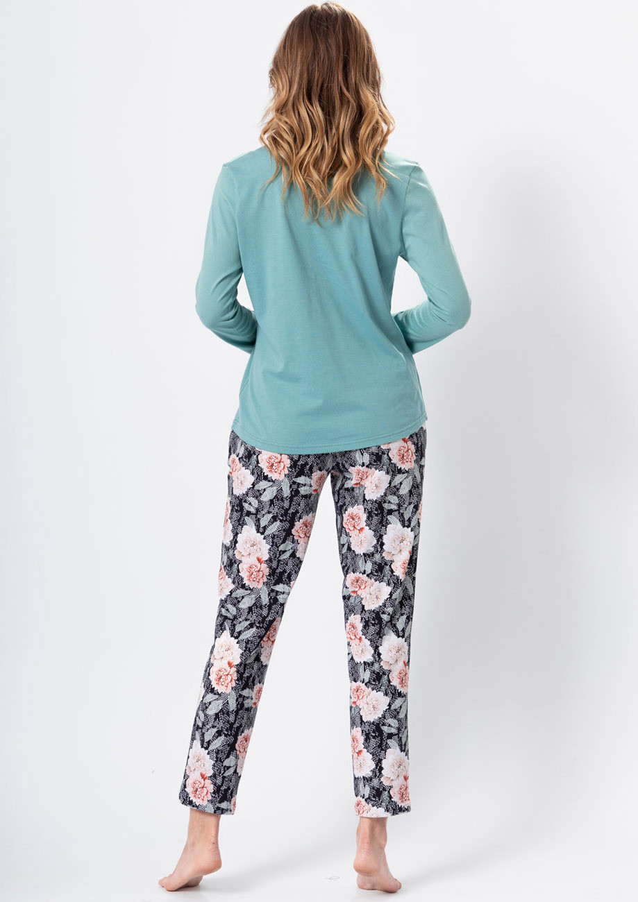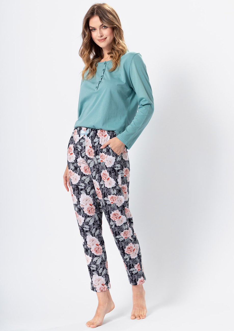 dámske pyžamo s dlhými rukávmi a dlhými nohavicami s bočnými vreckami vyrobené z vysoko kvalitného mäkkého, hladkého úpletu zo 100% bavlny. Pyžamo je vyhotovené s všívanou gumou v páse nohavíc.