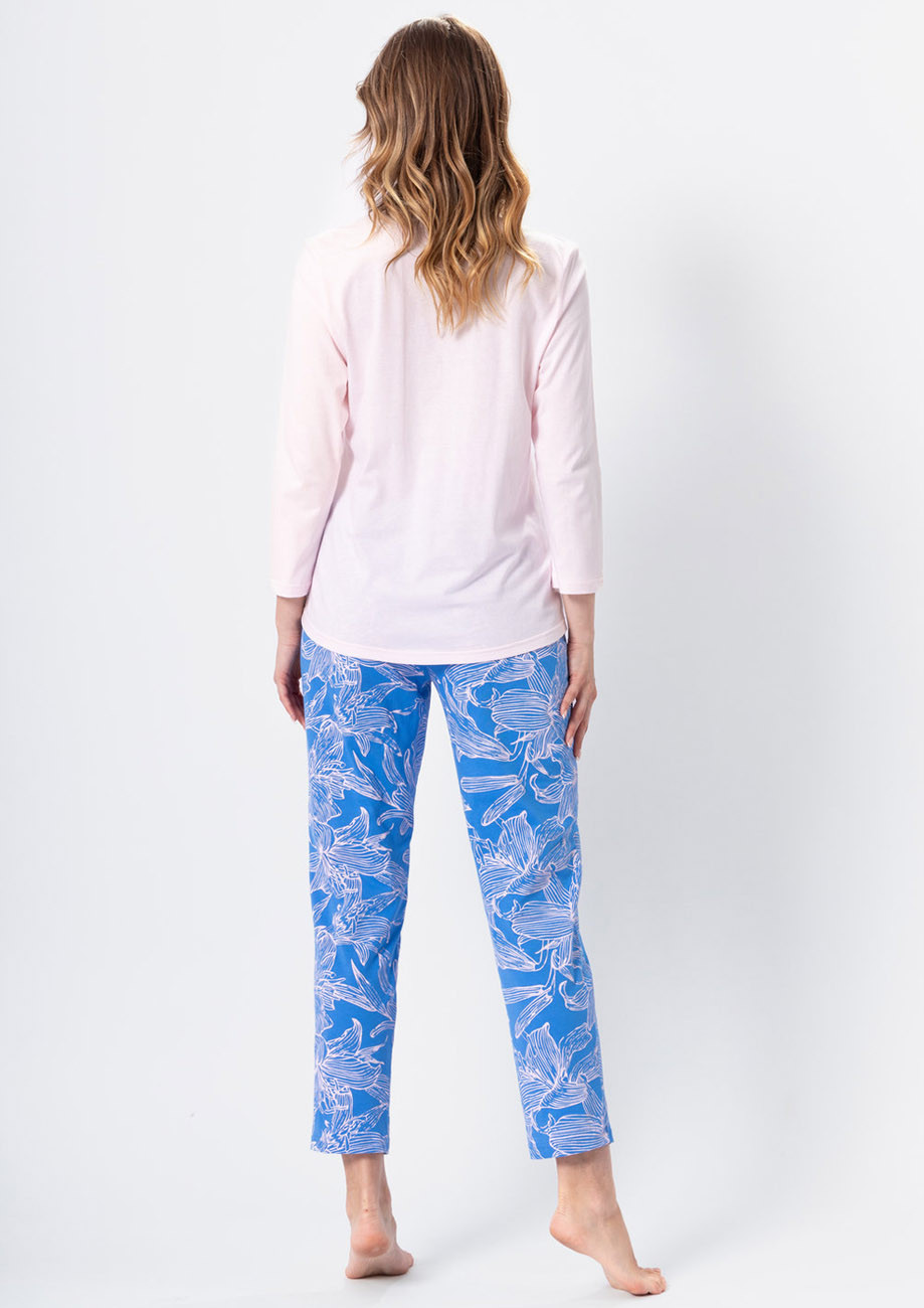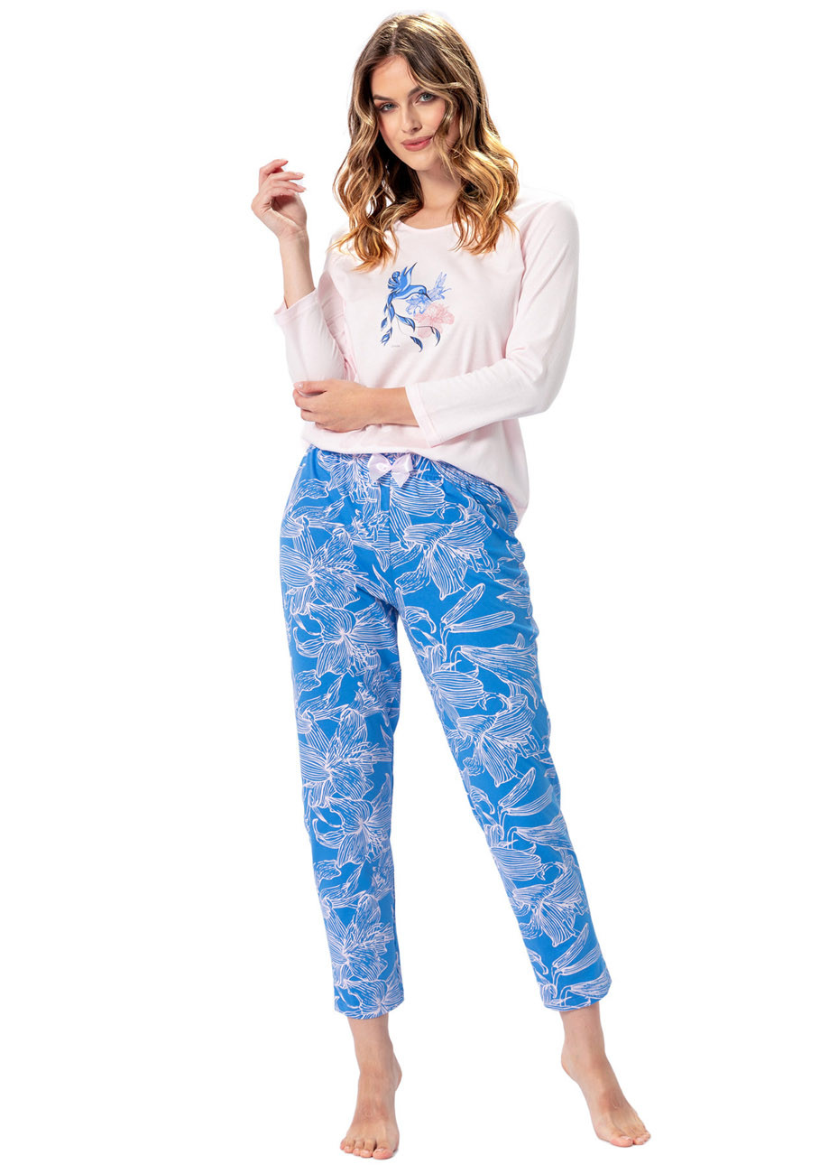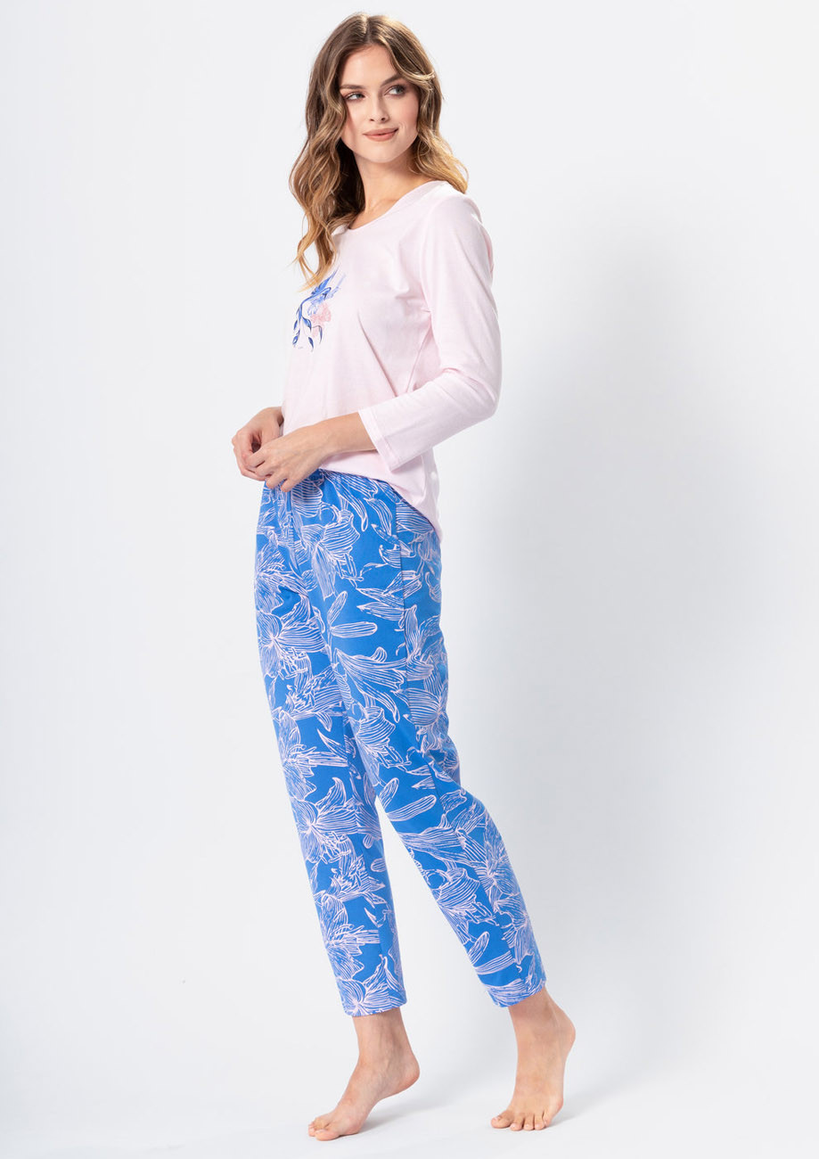 dámske pyžamo s dlhými rukávmi a dlhými nohavicami vyrobené z úpletu zo 100% bavlny. Pyžamo je vyhotovené s všívanou gumou v páse nohavíc.