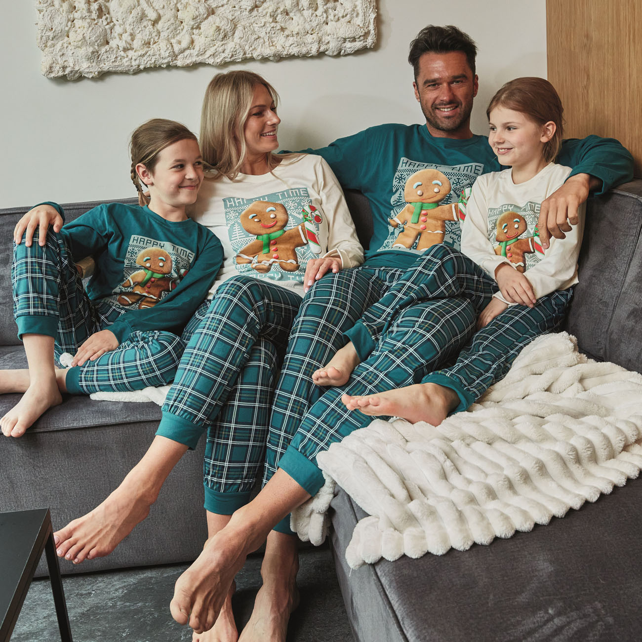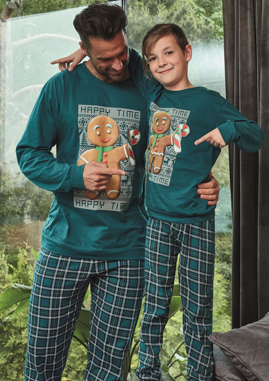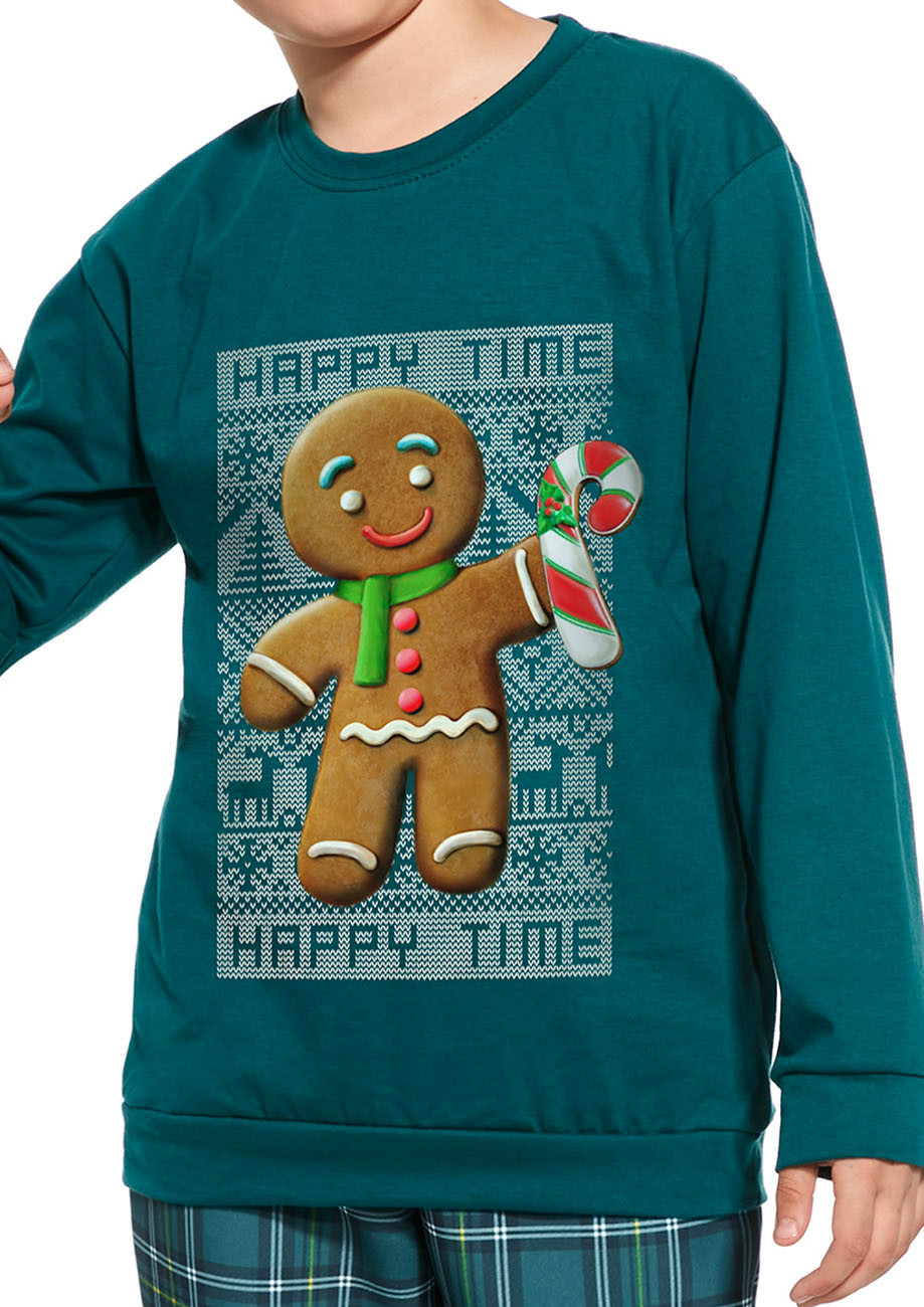 chlapčenské vianočné pyžamo s dlhým rukávom a dlhými nohavicami, spodná časť rukávov a nohavíc stiahnutá do pružného lemu, všívaná široká guma v páse nohavíc. Pyžamo je vyrobené zo 100% bavlneného úpletu. Pyžamo je z rodinnej kolekcie otec a syn, matka a dcéra ( pánske pyžamo 115/234-Cookie, chlapčenské pyžamo 966/153-Cookie, dievčenské pyžamo 592/171-Cookie, 594/171-Cookie, dámske pyžamo 671/347-Cookie)