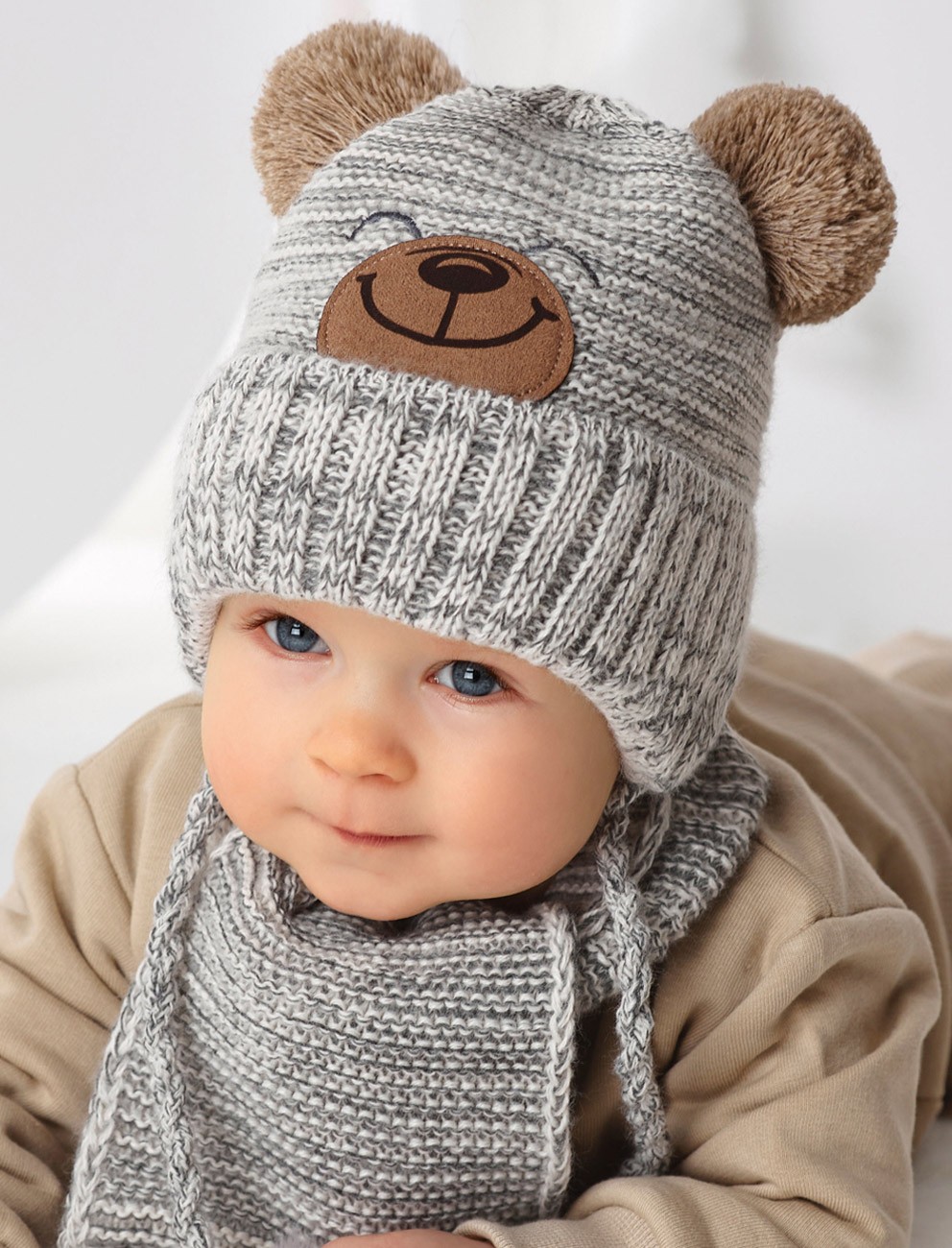 Detská teplá zimná čiapka so šálom. Čiapka je podšitá mäkkou podšívkou z elastického úpletu. Viazanie na šnúrku pod bradou dieťaťa.