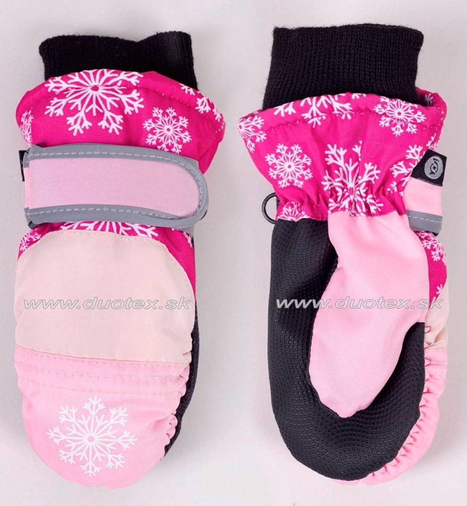Detské teplé rukavice lyžiarského typu. Rukavičky majú vysokú manžetu a vnútro je vyteplené hrubou hrejivou vrstvou. V oblasti dlane je opatrená pogumovaným materiálom.