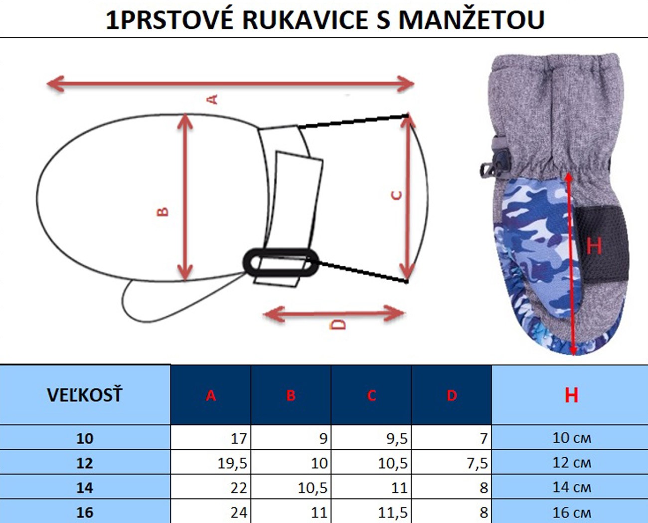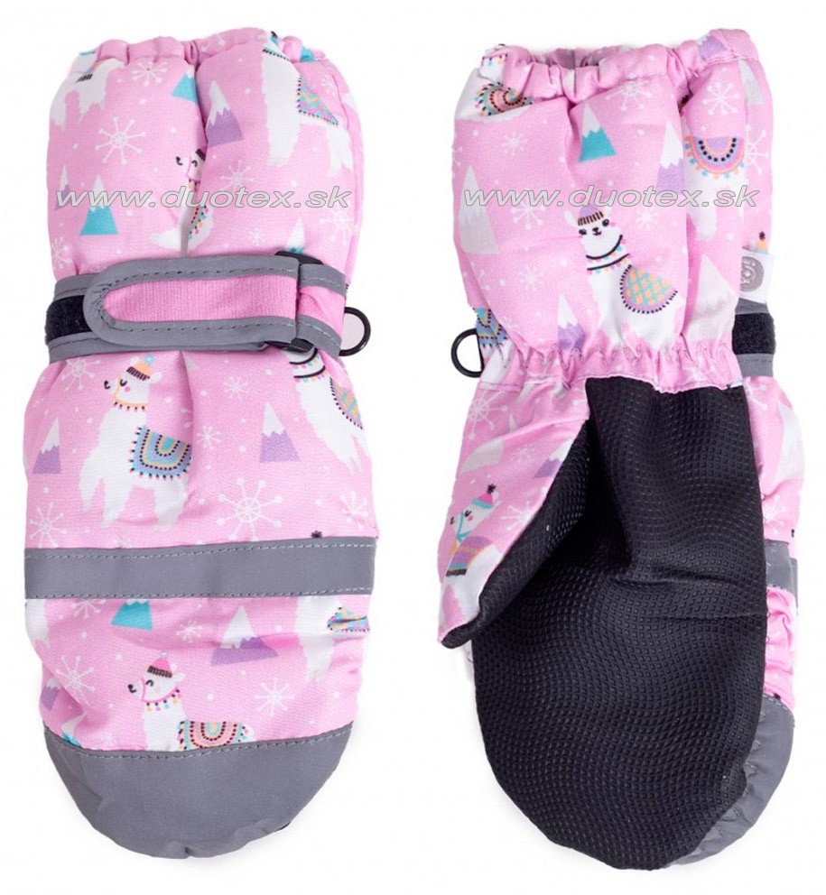 Detské teplé rukavice lyžiarského typu. Rukavičky majú vysokú manžetu a vnútro je vyteplené hrubou hrejivou vrstvou. V oblasti dlane je opatrená pogumovaným materiálom.