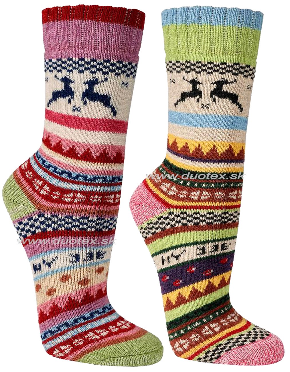 dámske teplé tradičné zimné ponožky s obľúbeným severským - nórskym vzorom. Ponožky sú vyhotovené s vysokým podielom hrejivej vlny a froté vrstvou vo vnútri ponožky. Dvojpack sa skladá z dvoch párov rôznych farieb - viď. obrázok.