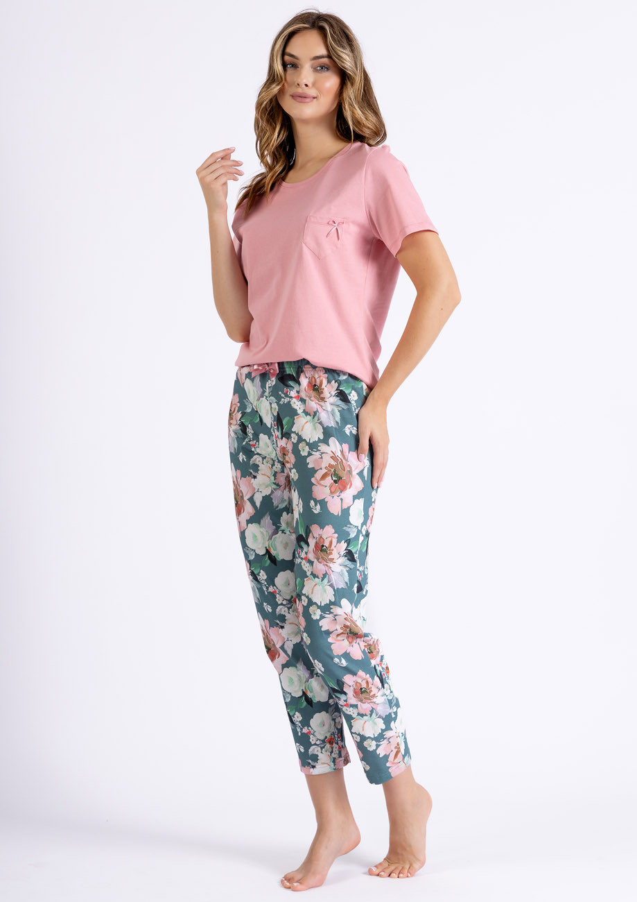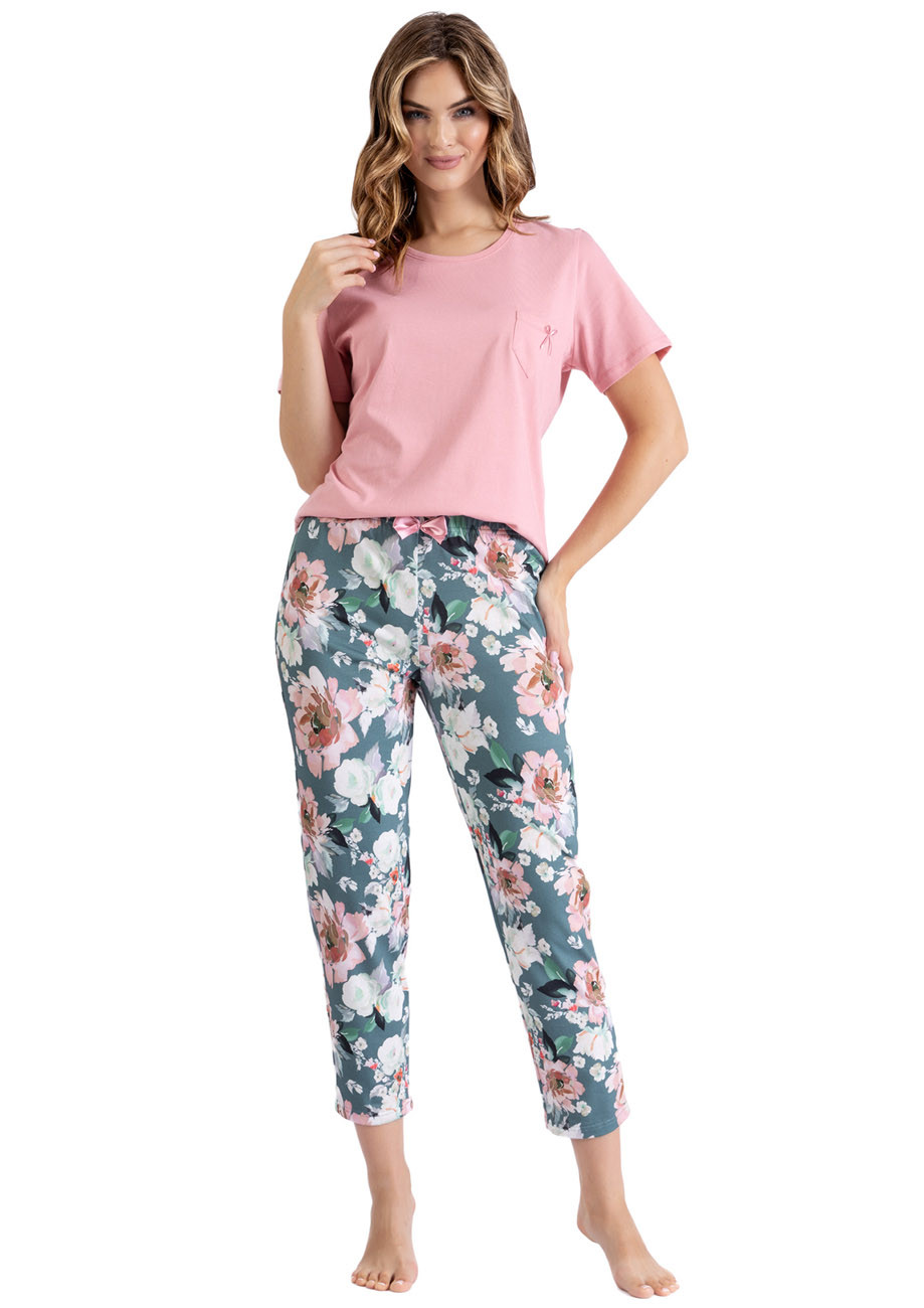 Dámske pyžamo s krátkymi rukávmi a dlhými nohavicami vyrobené zo 100% bavlny, všívaná guma v páse nohavíc.