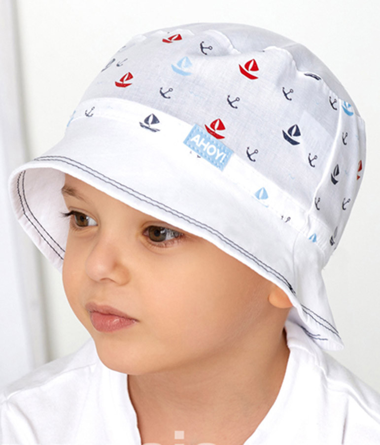 Detský letný klobúčik vyrobený z tenkej bavlnenej tkaniny v zadnej časti stiahnutý do gumičky.