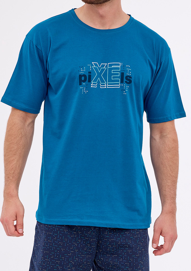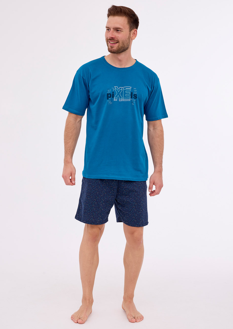 Pánske pyžamo s krátkym rukávom a krátkymi nohavicami vyrobené z bavlneného úpletu.