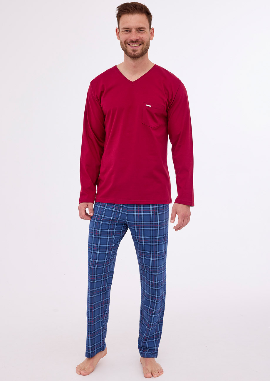 Pánske pyžamo s dlhým rukávom a dlhými nohavicami, všívaná guma v páse nohavíc. Pyžamo je vyrobené z kvalitného úpletu zo 100% bavlny.