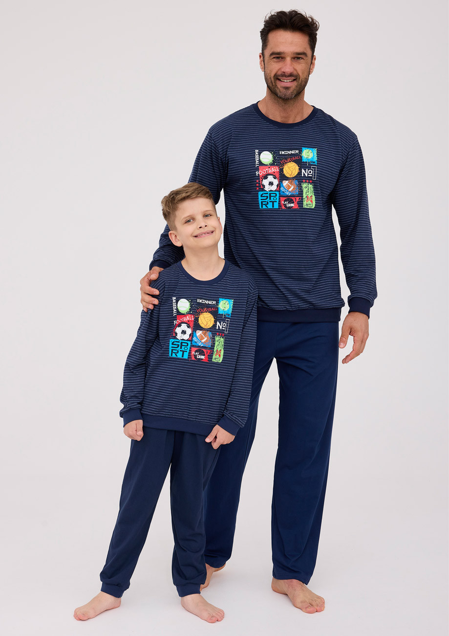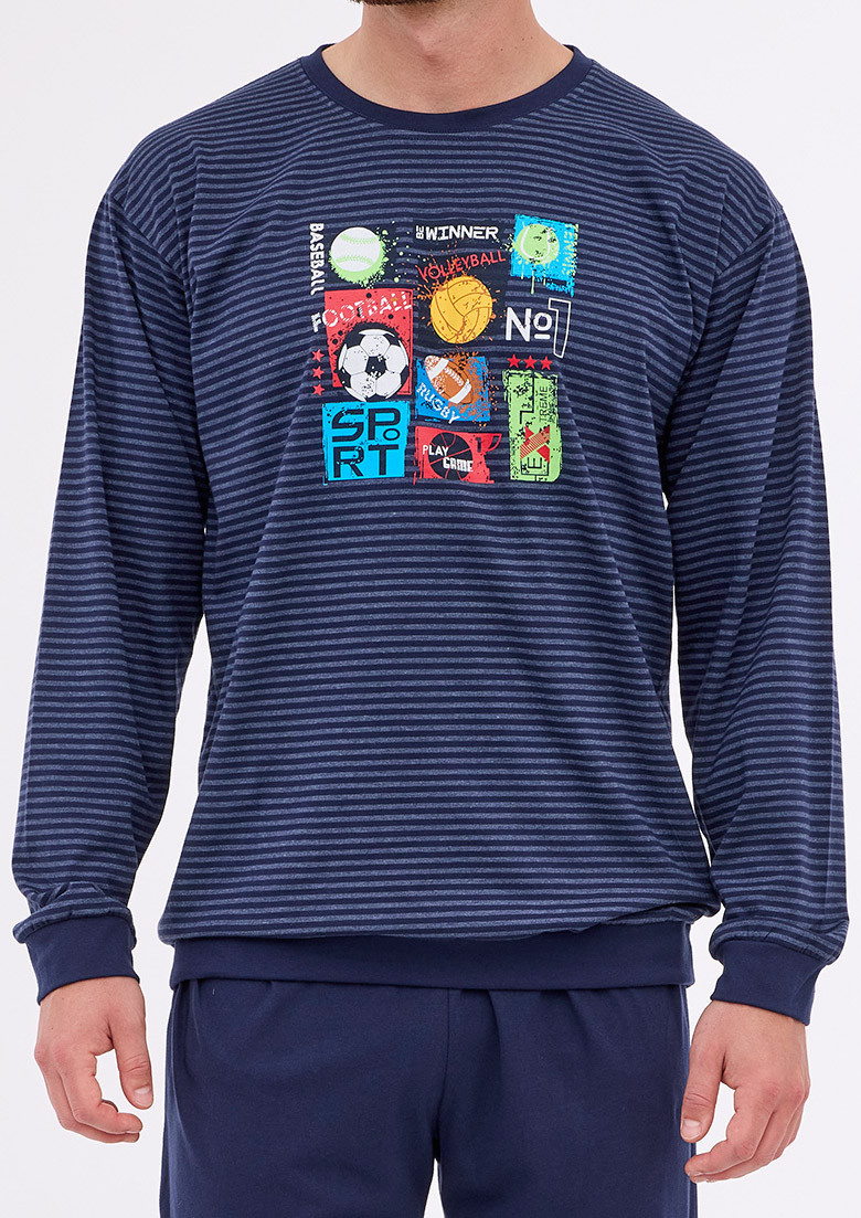 pánske pyžamo s dlhým rukávom a dlhými nohavicami - všívaná guma v páse nohavíc. Spodná časť vrchného dielu, rukávov a nohavíc je stiahnutá do pružného lemu. Je súčasťou kolekcie ,,Winner´´