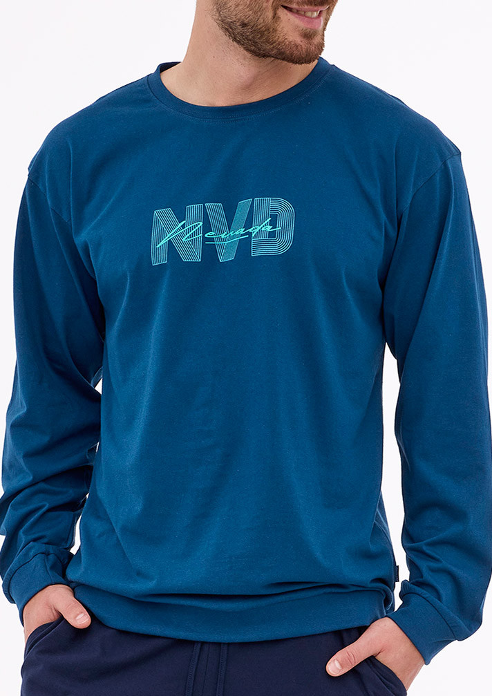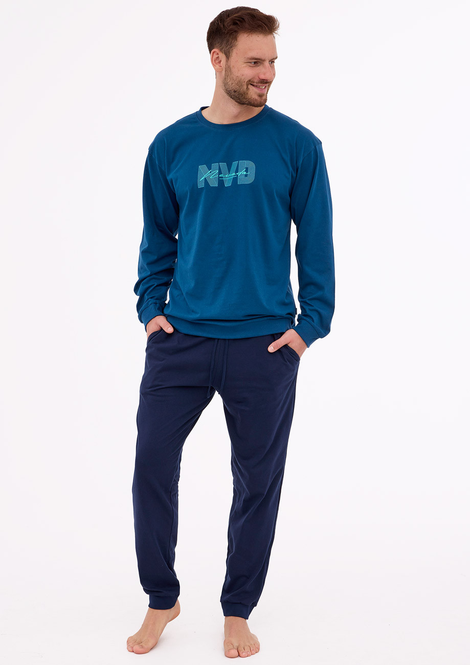 Pánske pyžamo s dlhým rukávom a dlhými nohavicami. Všívaná guma v páse nohavíc. Spodná časť vrchného dielu, rukávov a nohavíc je stiahnutá do pružného lemu.