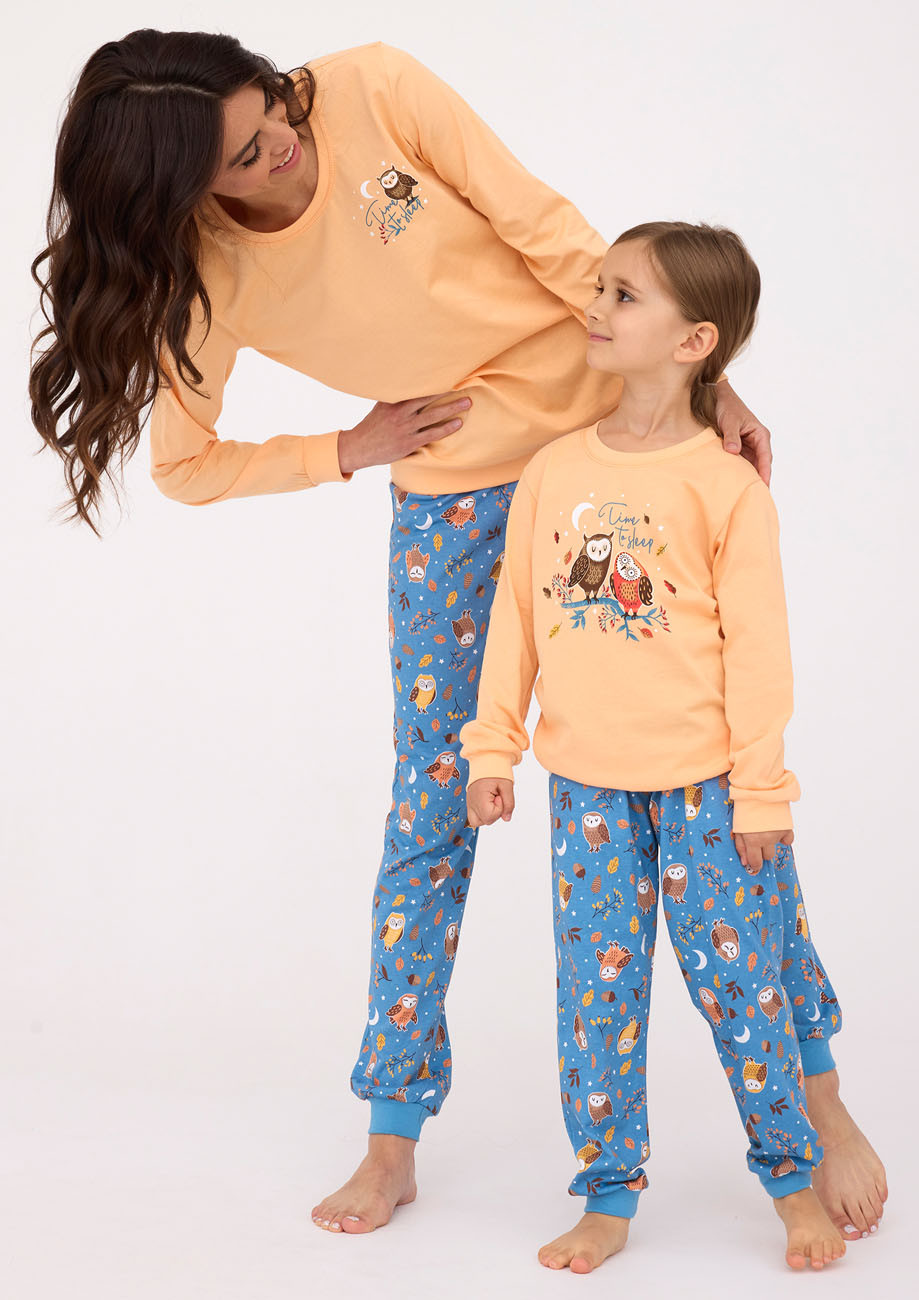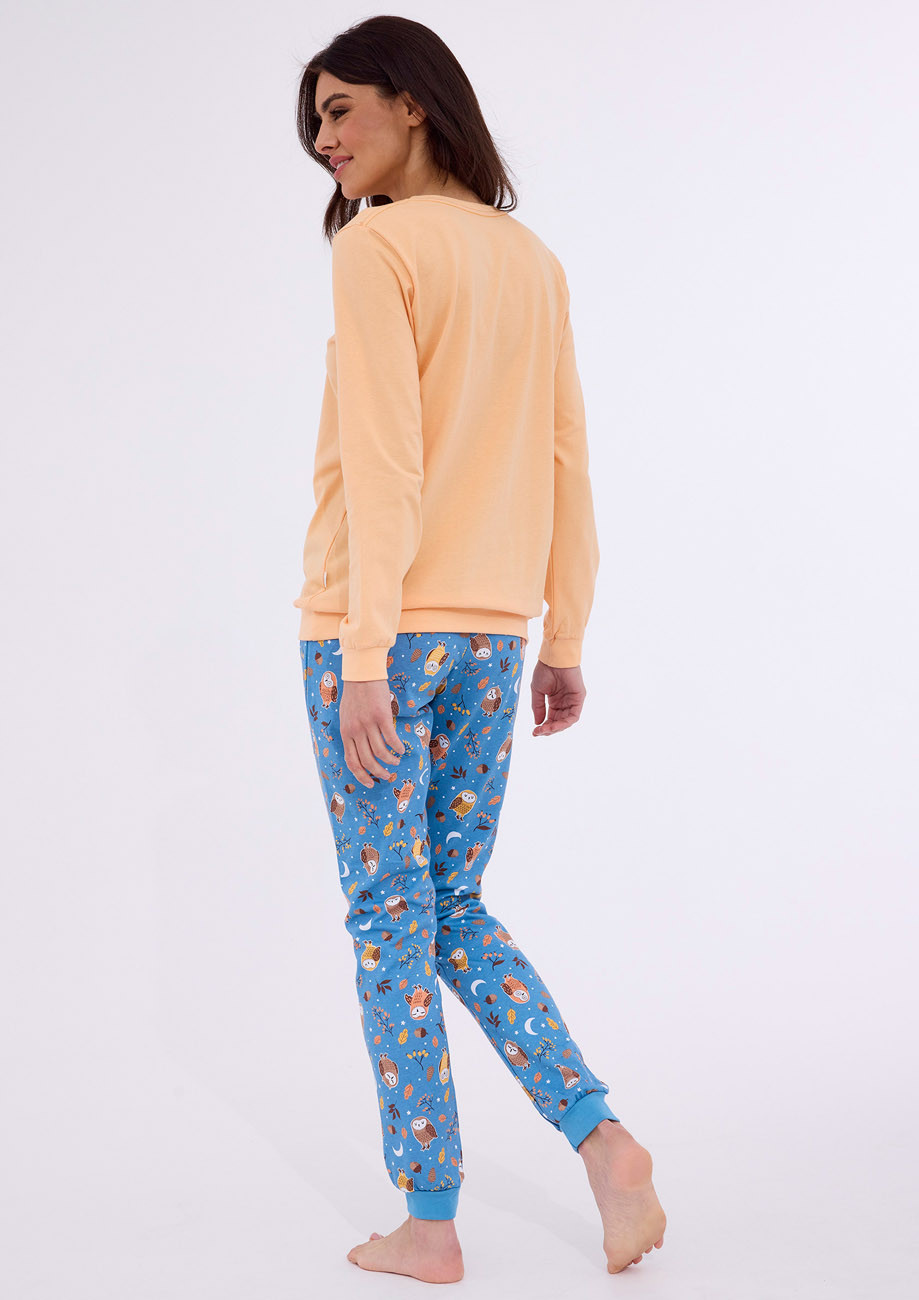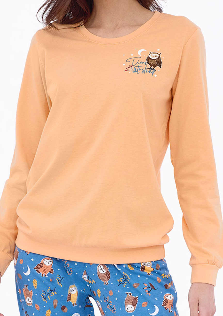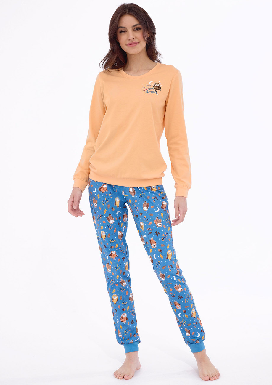 dámske pyžamo s dlhým rukávom a dlhými nohavicami ukončenými pružným lemom vyrobené zo 100% jemného bavlneného úpletu - všívaná guma v páse nohavíc. Je súčasťou kolekcie ,,Owls´´