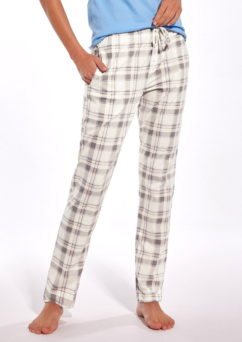 Dámske dlhé pyžamové nohavice s bočnými vreckami vyrobené z úpletu zo 100% bavlny - všívaná guma a tunel so sťahovacou šnúrkou v páse nohavíc.