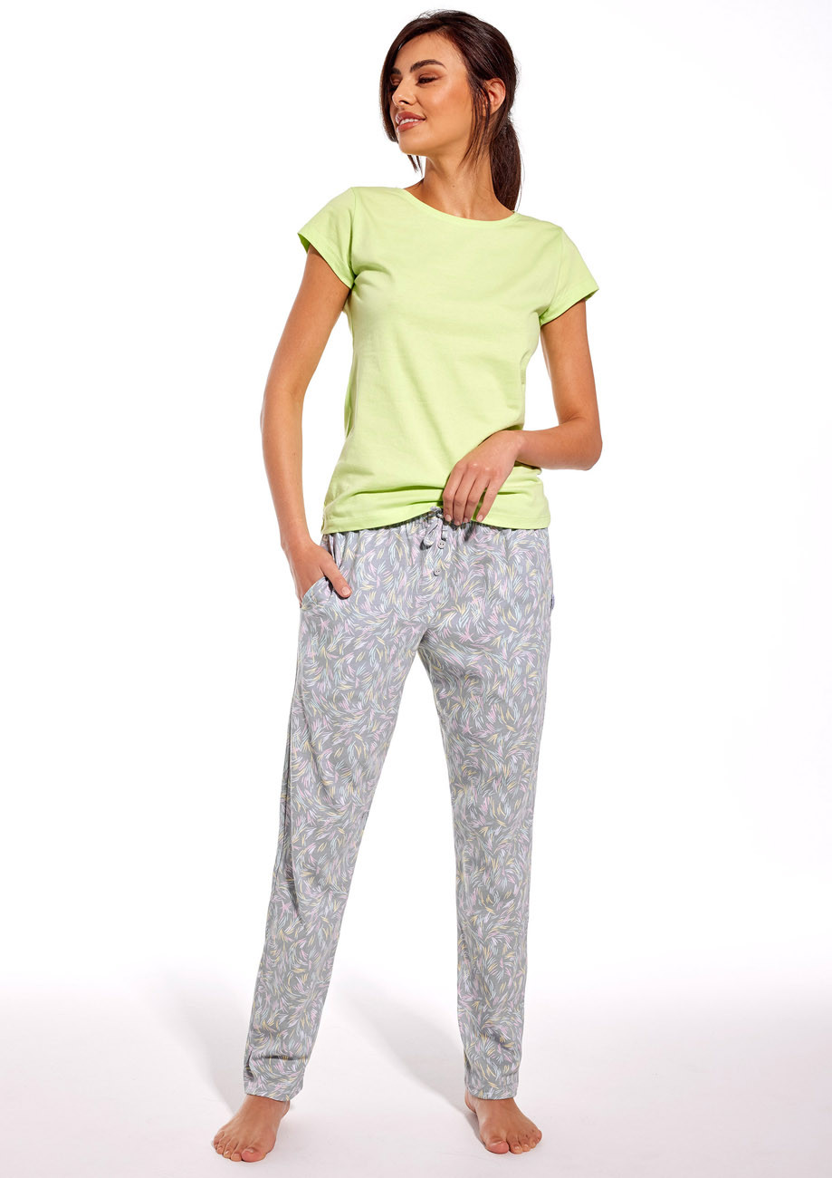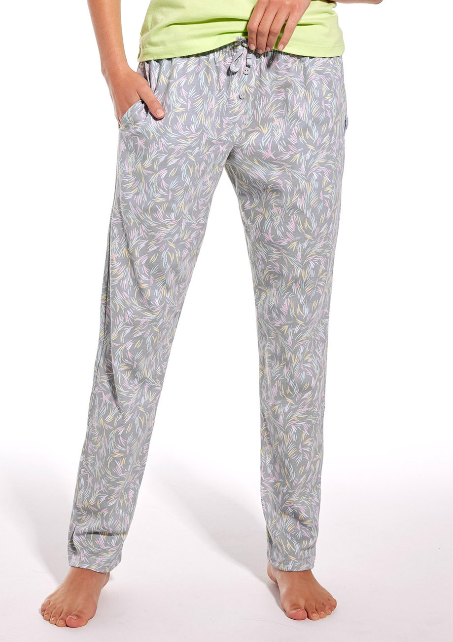 Dámske dlhé pyžamové nohavice s bočnými vreckami vyrobené z úpletu zo 100% bavlny - všívaná guma a tunel so sťahovacou šnúrkou v páse nohavíc.