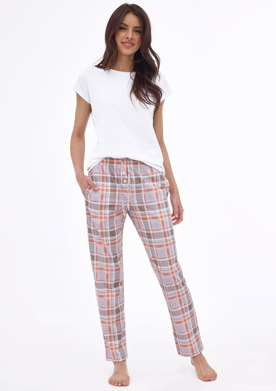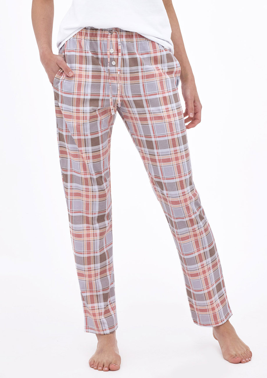 Dámske dlhé pyžamové nohavice s bočnými vreckami vyrobené z úpletu zo 100% bavlny - všívaná guma a tunel so sťahovacou šnúrkou v páse nohavíc.
