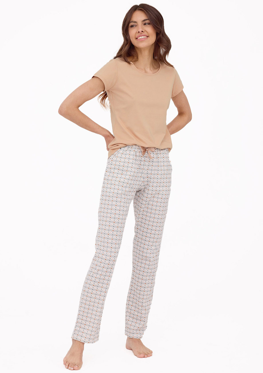 Dámske pyžamo s krátkym rukávom a dlhými nohavicami vyrobené z úpletu zo 100% bavlny, všívaná guma v páse nohavíc