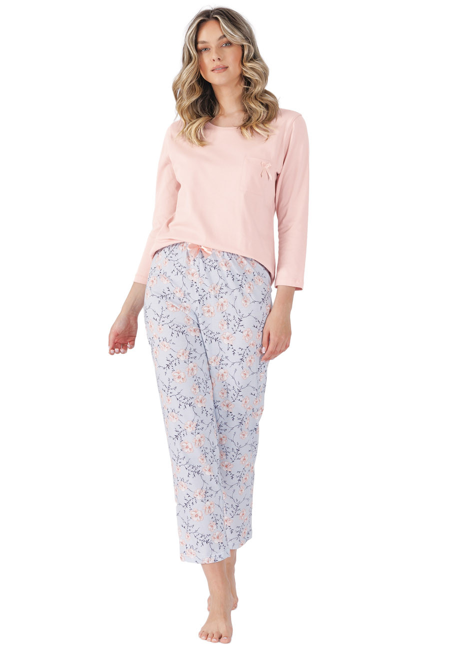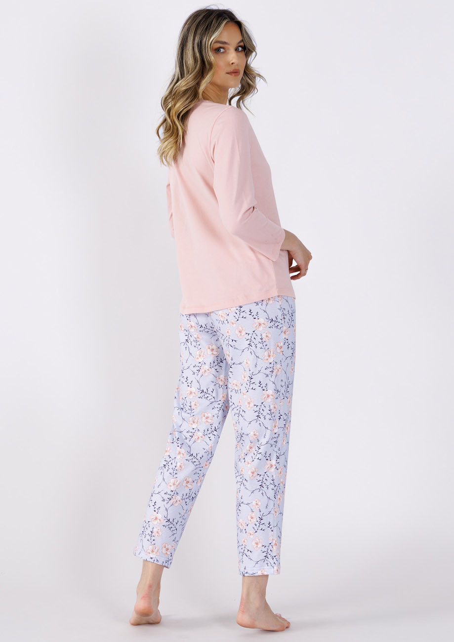 dámske pyžamo s dlhými rukávmi a dlhými nohavicami vyrobené zo 100% bavlneného úpletu. V páse nohavíc je všívaná guma.