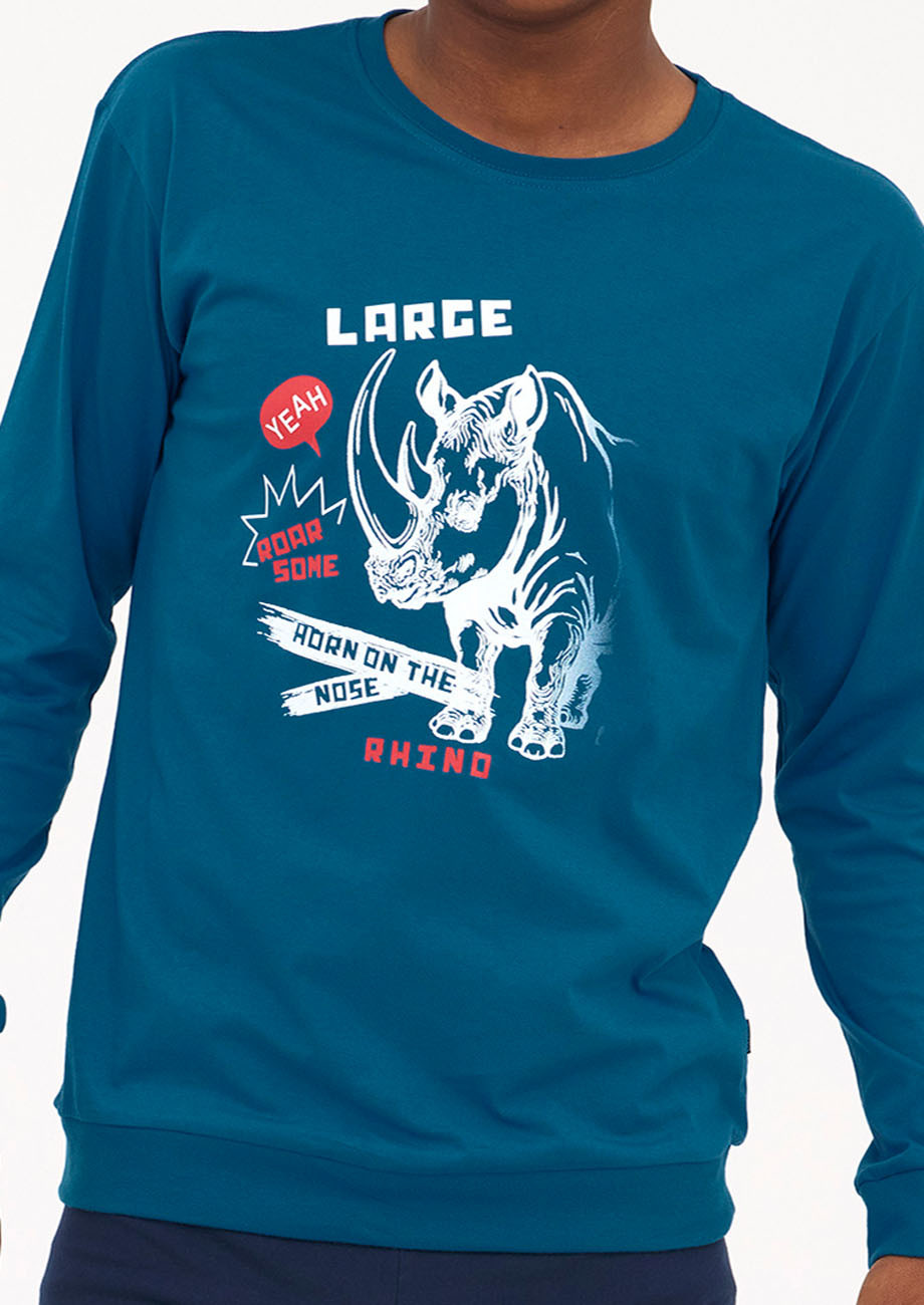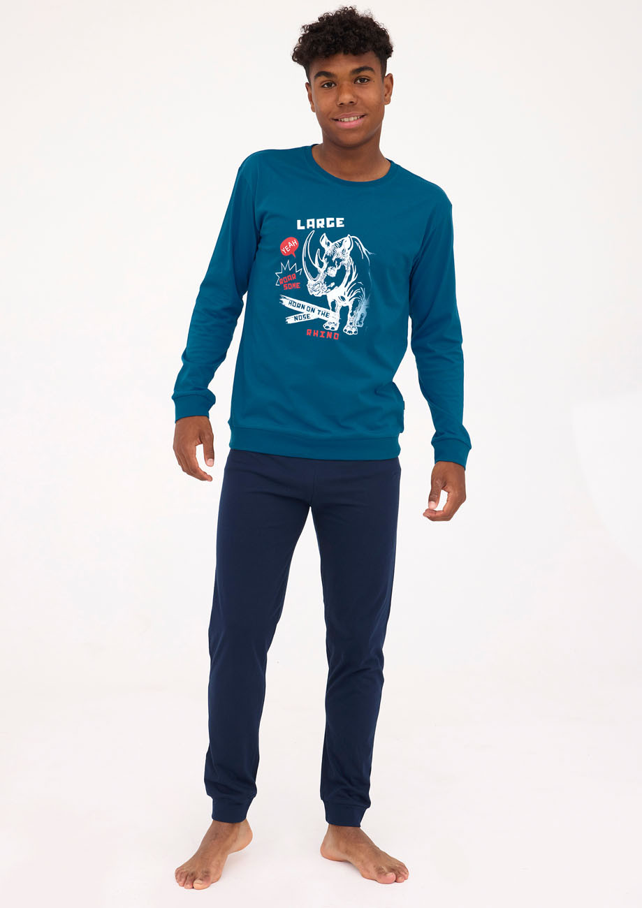 pyžamo s dlhým rukávom a dlhými nohavicami určené pre starších chlapcov a vyššie štíhle postavy. Spodná časť rukávov a nohavíc je stiahnutá do pružného lemu, všívaná široká guma v páse nohavíc. Pyžamo je vyrobené zo 100% bavlneného úpletu.