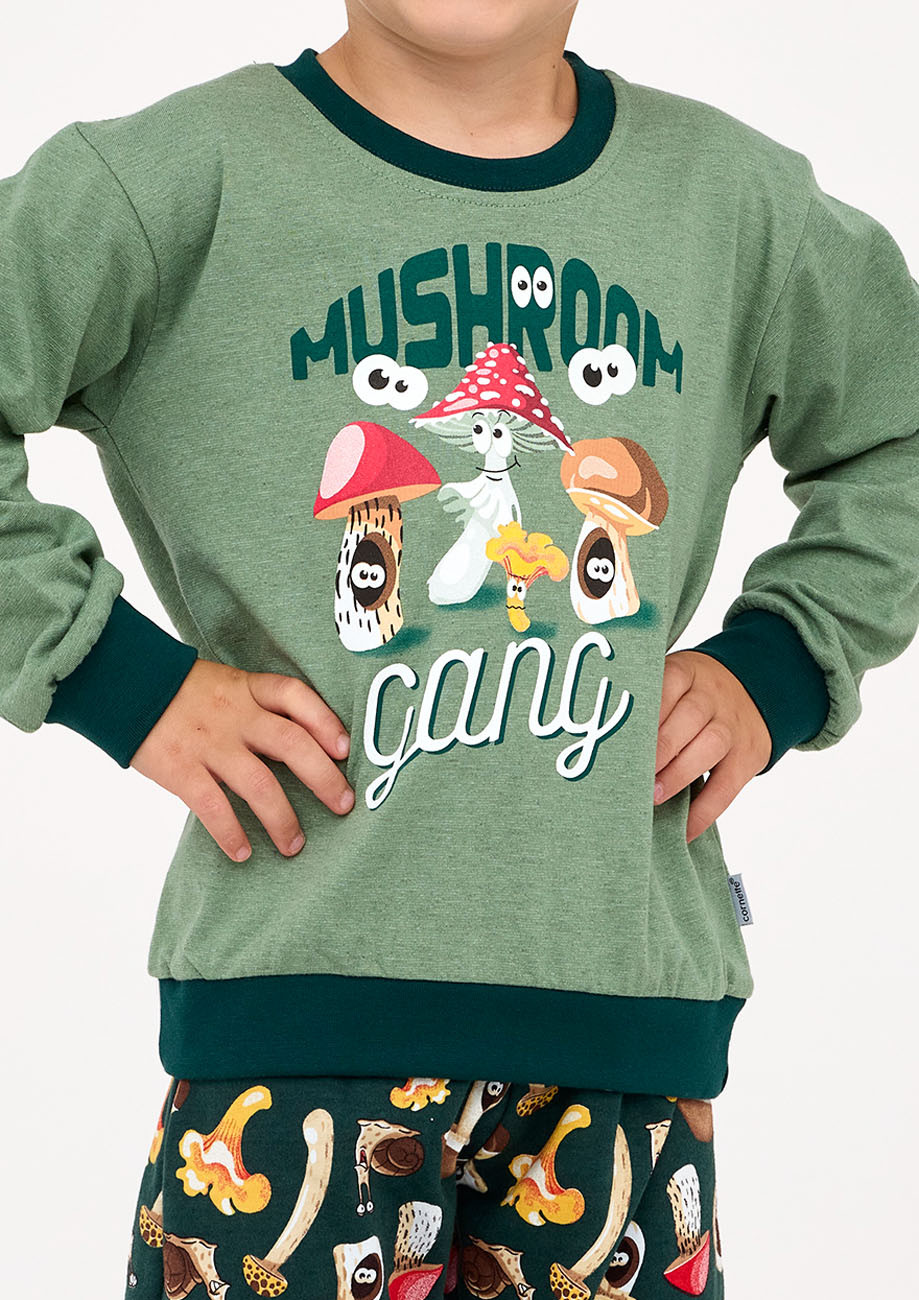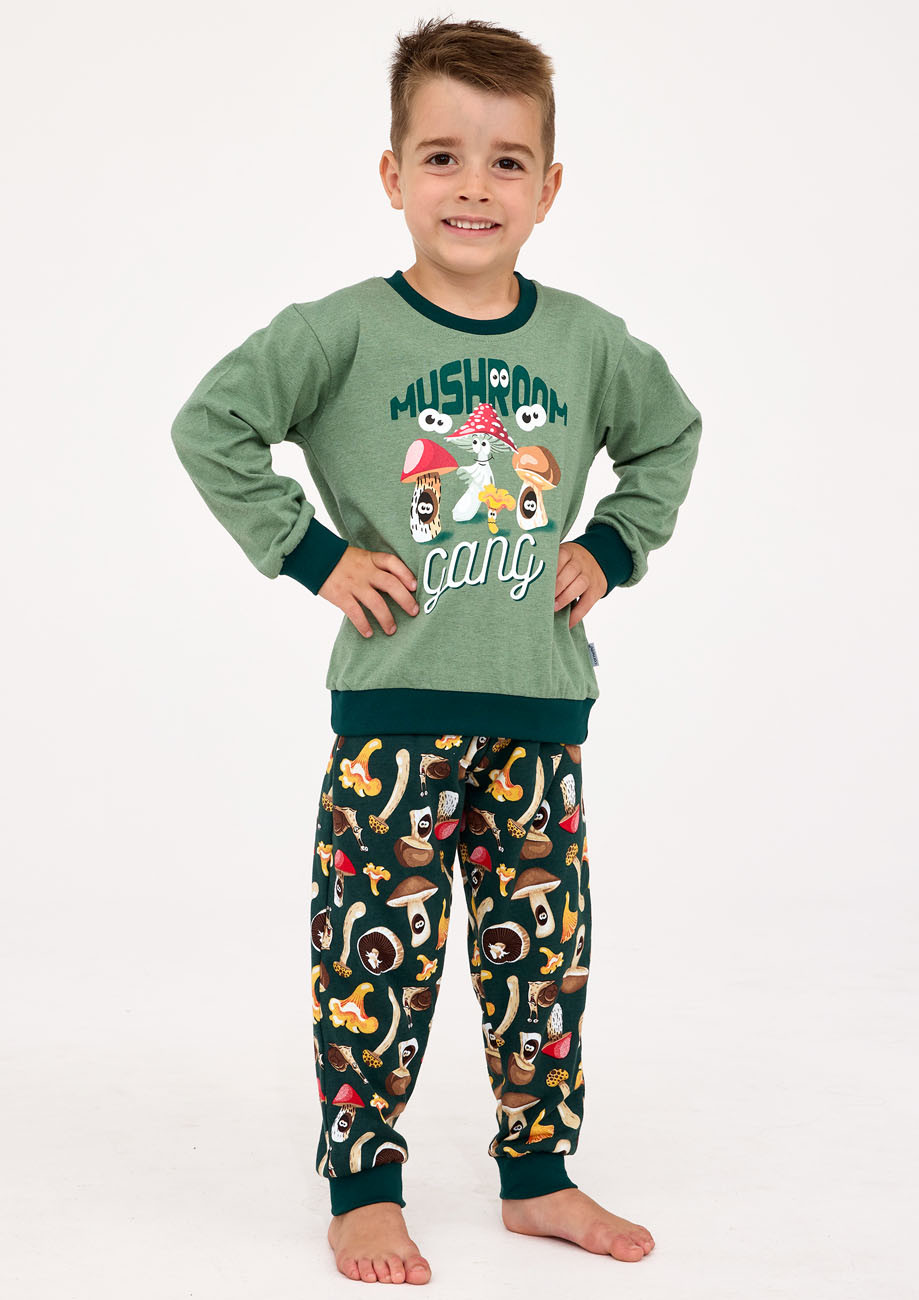 chlapčenské pyžamo s dlhým rukávom a dlhými nohavicami, všívaná široká guma v páse nohavíc. Spodná časť vrchného dielu, rukávov i nohavíc je ukončená pružným patentom.