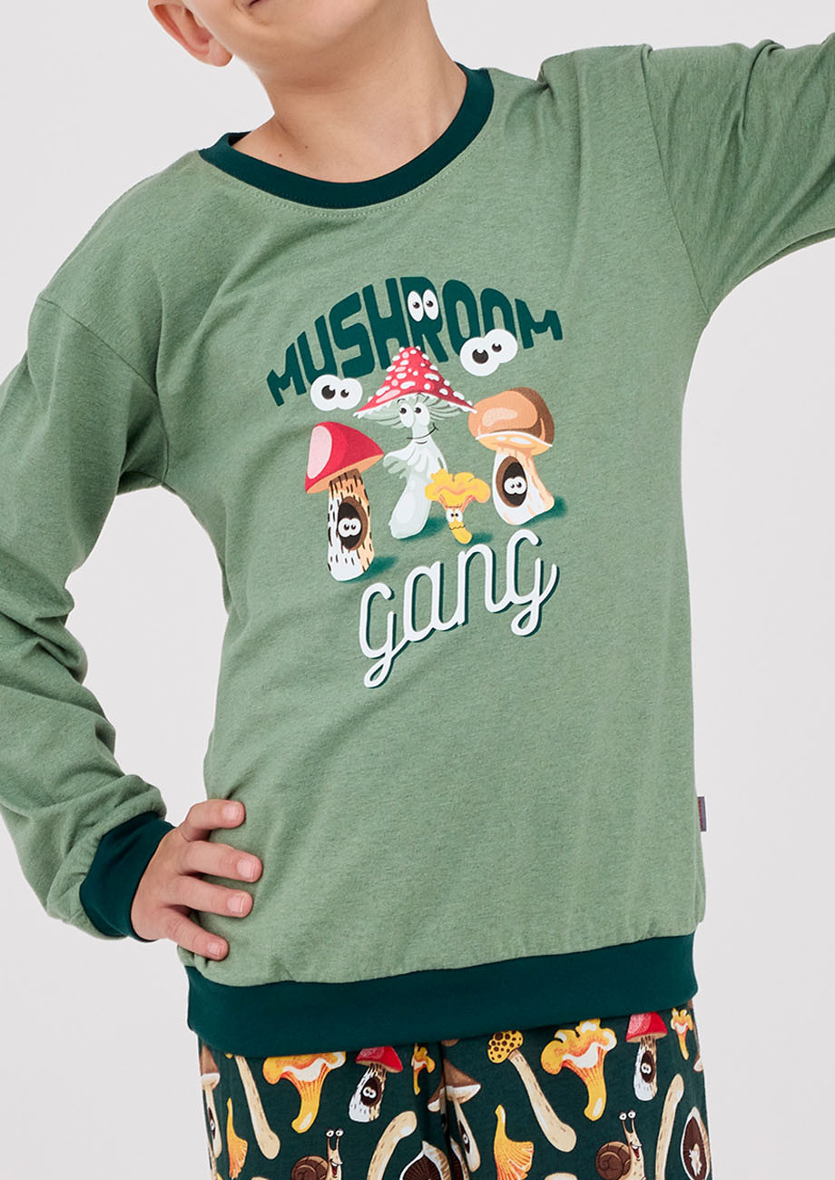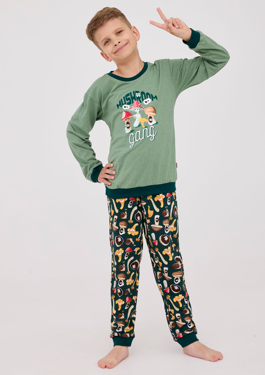 Chlapčenské pyžamo s dlhým rukávom a dlhými nohavicami, všívaná široká guma v páse nohavíc. Spodná časť vrchného dielu, rukávov i nohavíc je ukončená pružným patentom.