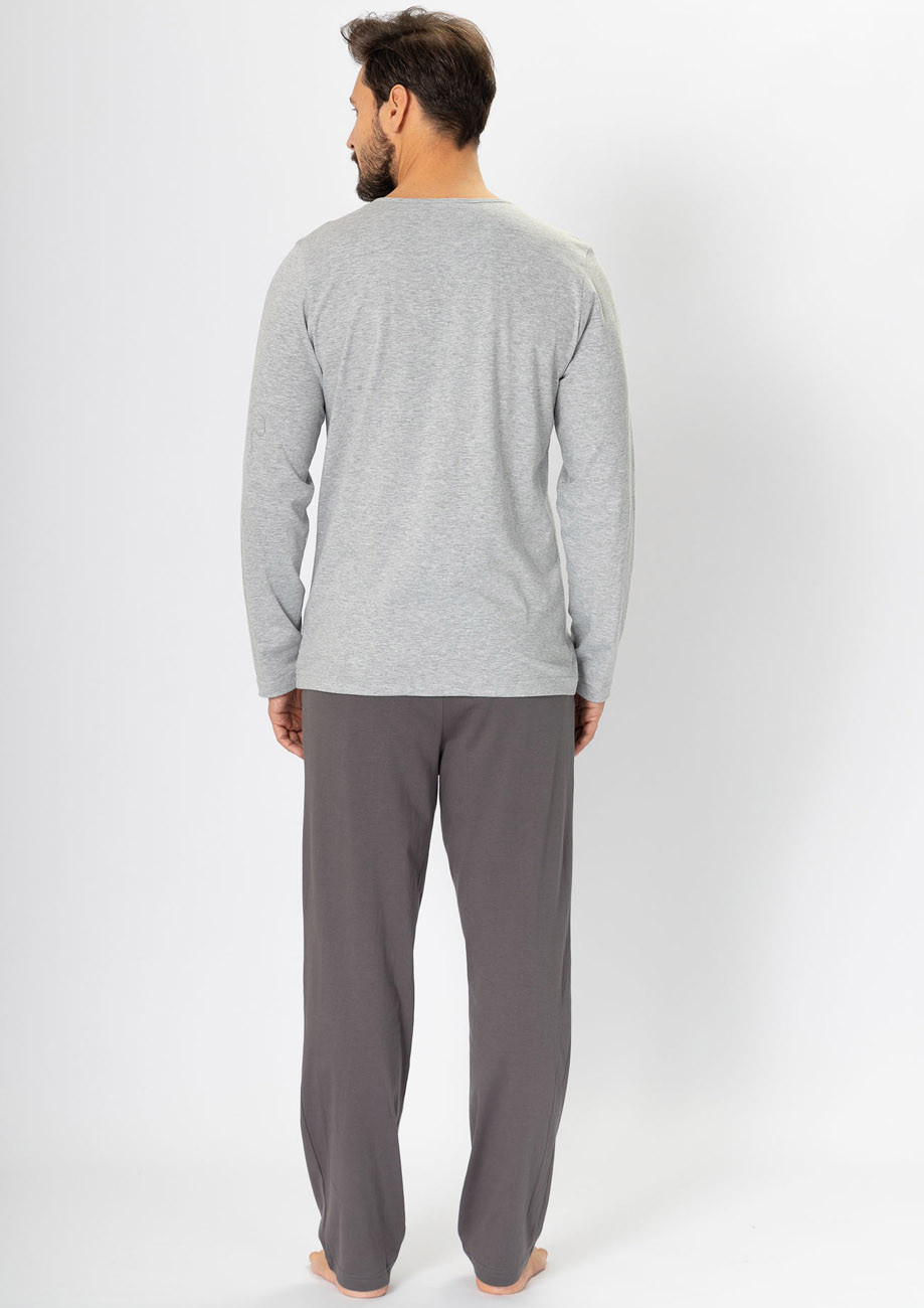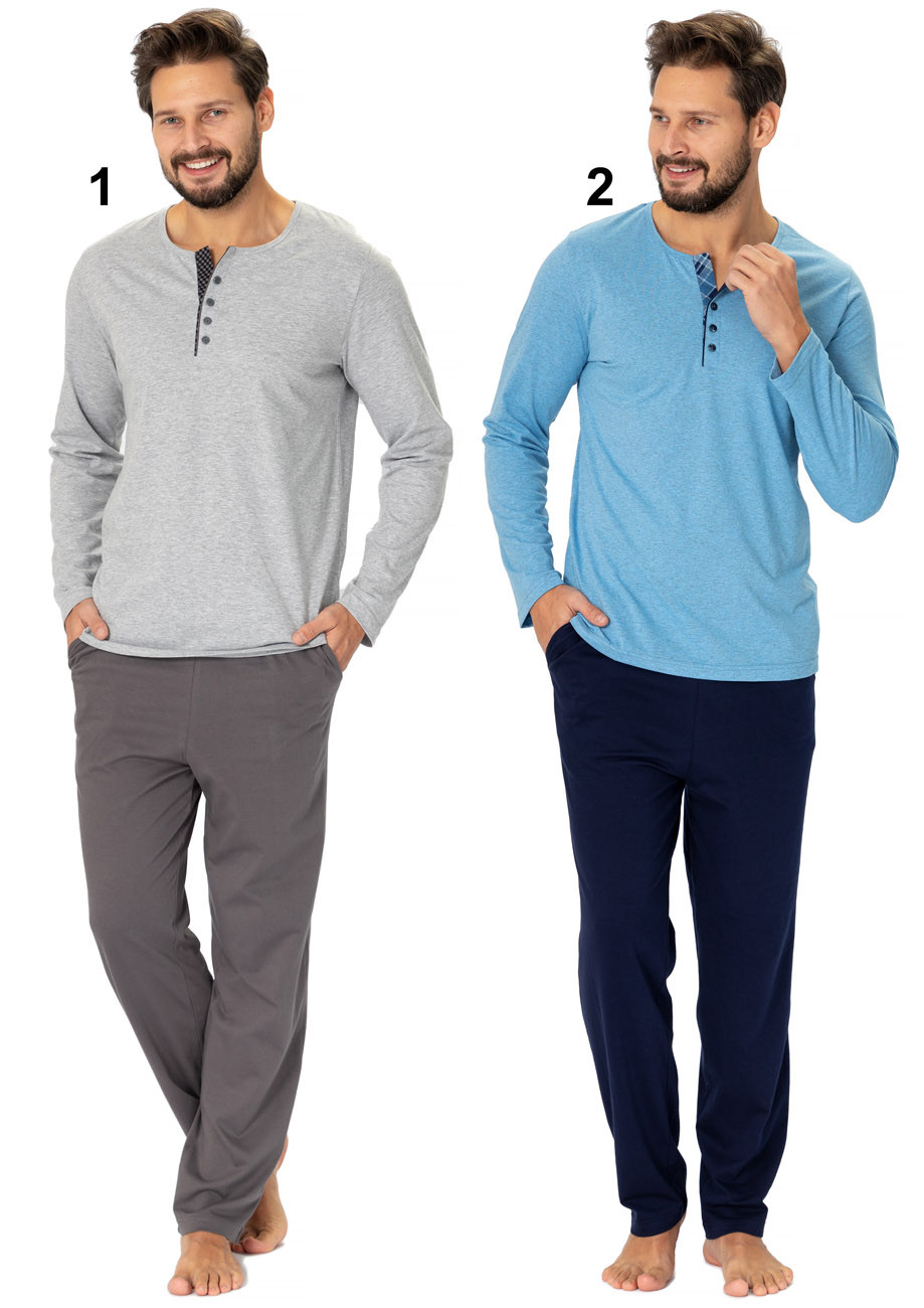 Pánske pyžamo s dlhým rukávom a dlhými nohavicami - všívaná guma v páse nohavíc. Vrchná časť s ozdobnou úzkou légou imitujúcou zapínanie.