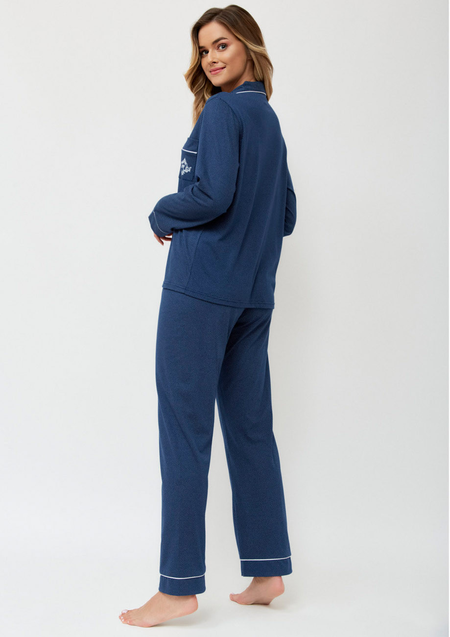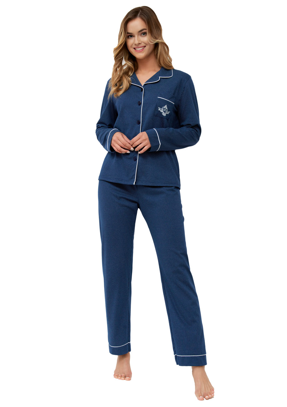 dámske pyžamo s dlhými rukávmi a dlhými nohavicami vyrobené zo 100% bavlny. Pyžamo je vyhotovené so zapínaním na gombíky a s všívanou gumou v páse nohavíc.