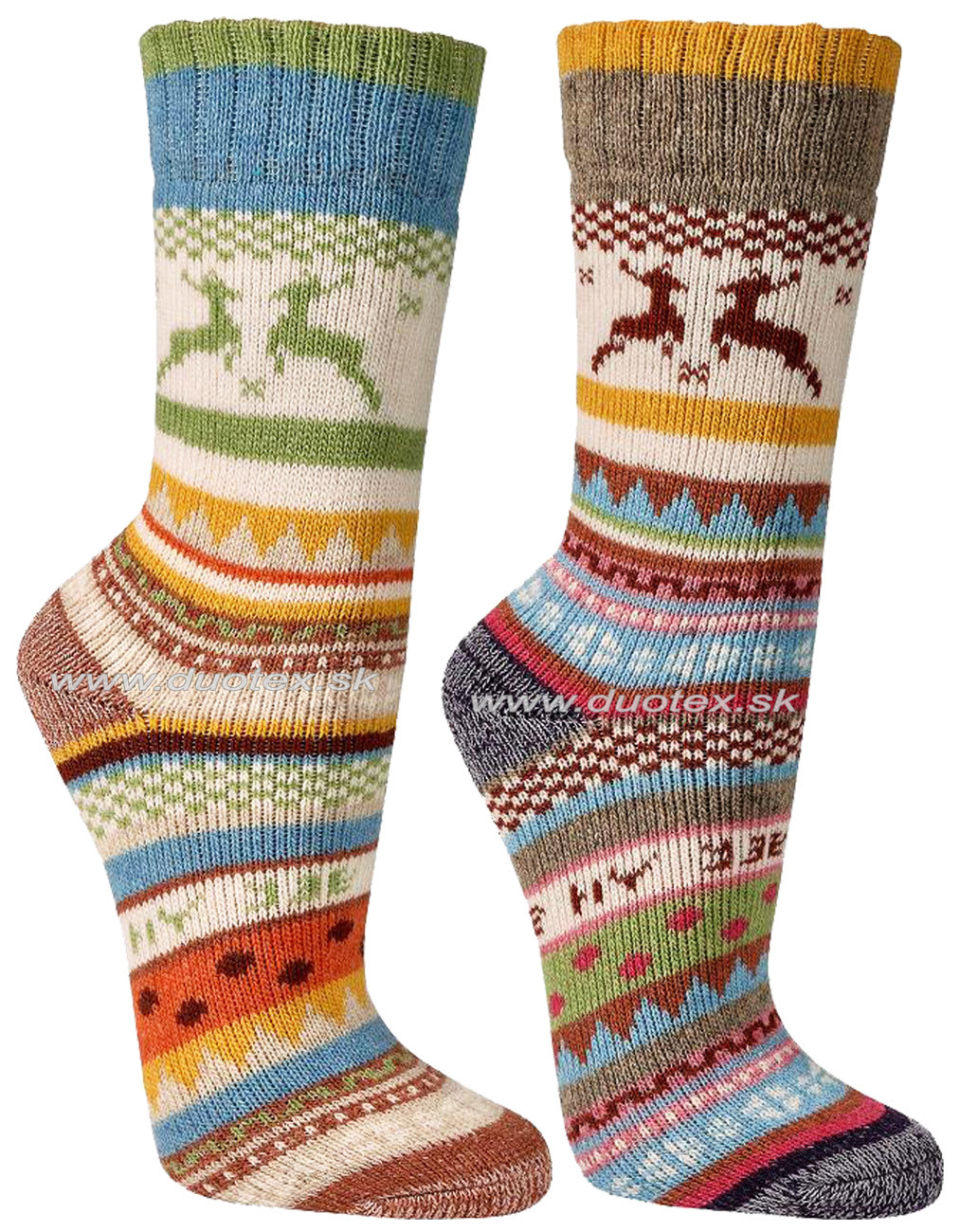 dámske teplé tradičné zimné ponožky s obľúbeným severským - nórskym vzorom. Ponožky sú vyhotovené s vysokým podielom hrejivej vlny a s froté vrstvou vo vnútri ponožky. Dvojpack sa skladá z dvoch párov rôznych farieb - viď. obrázok.